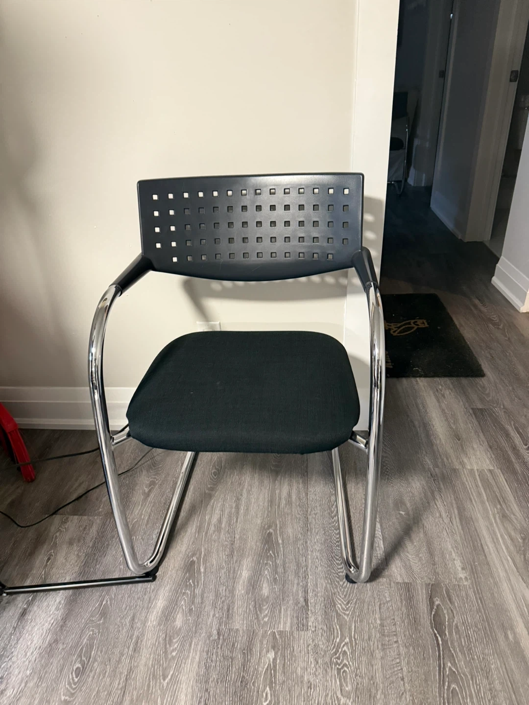 This is a black cantilever chair with a metal frame. It features a padded seat and a perforated backrest for ventilation. This chair is suitable for office or home use.