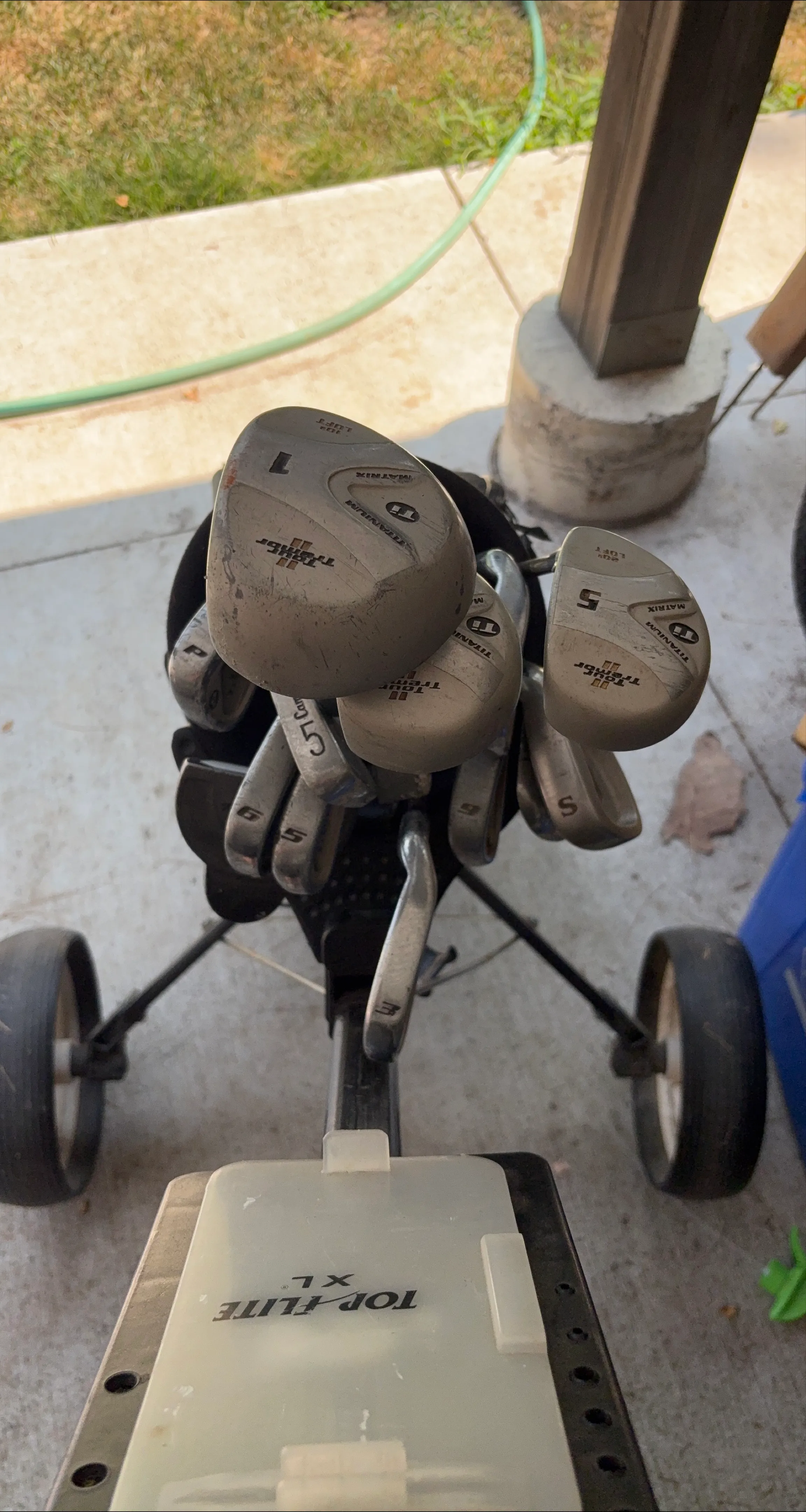 Set of Tour Tremor golf clubs including a driver (1), 5-iron, 3-iron, and a sand wedge (S). Clubs feature titanium heads and matrix shafts. Includes a Top-Flite XL golf cart. This set's suitable for beginner to intermediate golfers looking for a complete package.