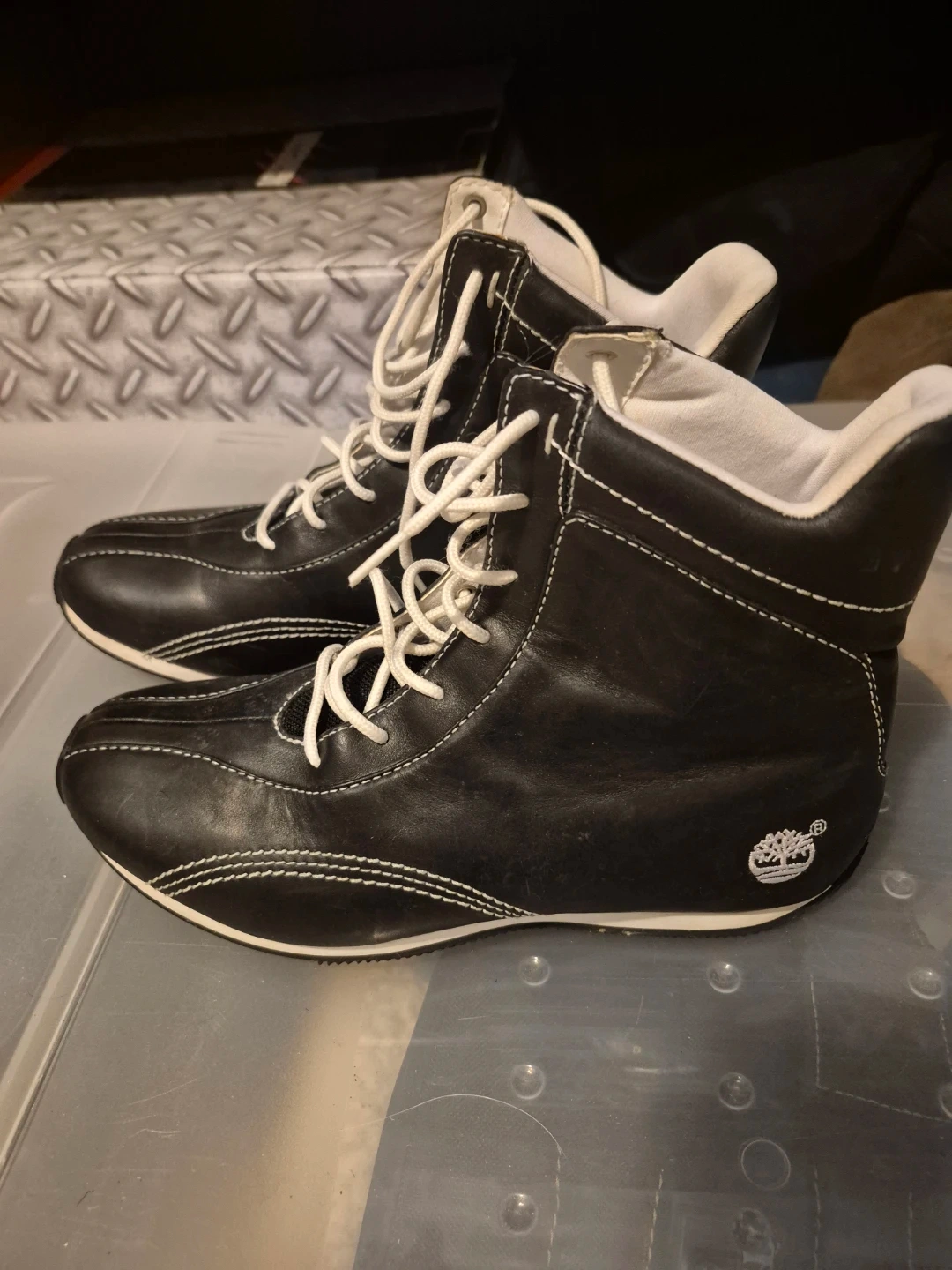 Timberland black leather high-top sneakers with white stitching. These shoes have laces and a white sole. They're made of leather.