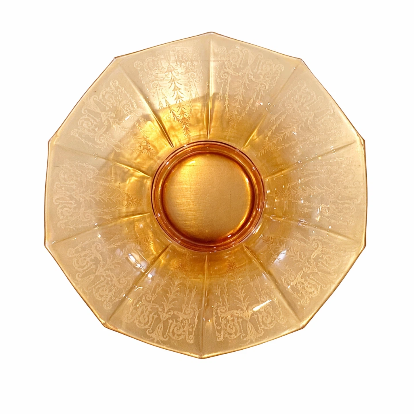 The bowl is executed in a rich amber (golden honey) glass, formed as a 10-sided decagon, a geometry strongly associated with Cambridge’s Art Deco and early Mid-Century production. Each side measures approximately 3¾ inches, creating a crisp, architectural profile that reflects light beautifully.