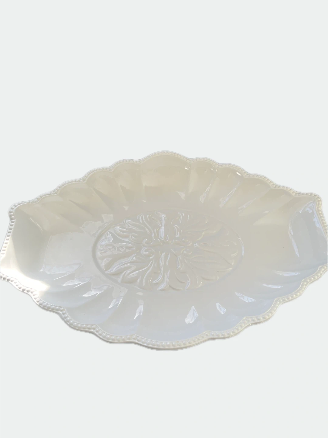 White ceramic serving platter with a beaded edge and embossed floral design. This oval dish is ideal for serving appetizers or main courses.