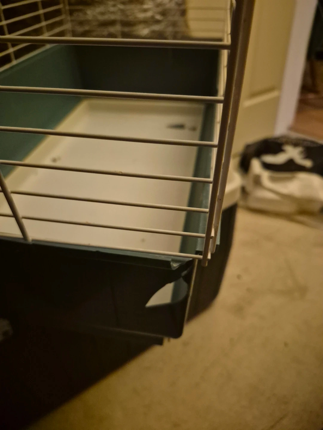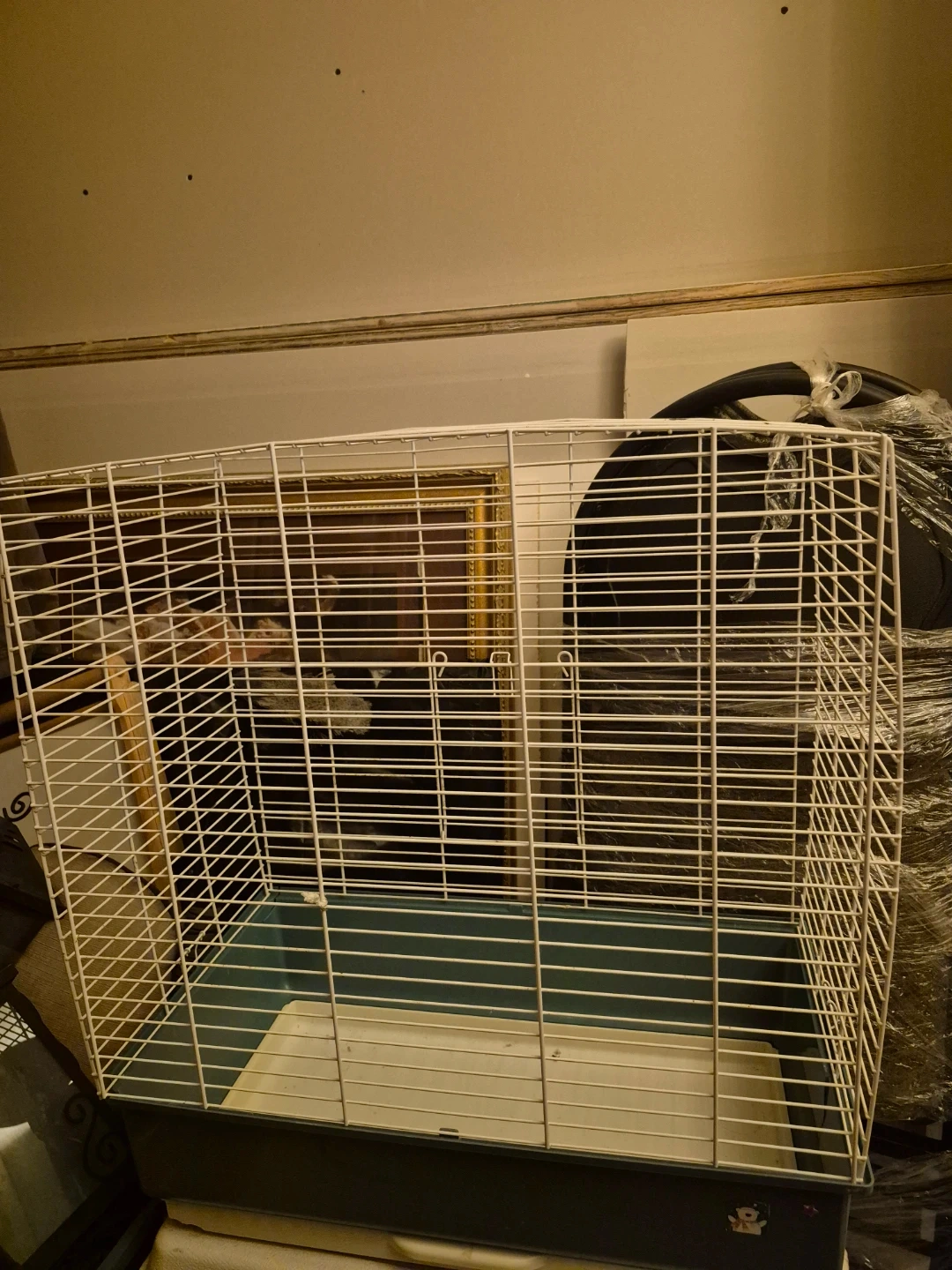 This is a small animal cage suitable for hamsters or other small pets. It has a white wire frame and a teal plastic base. The cage is easy to clean and provides ventilation for your pet.