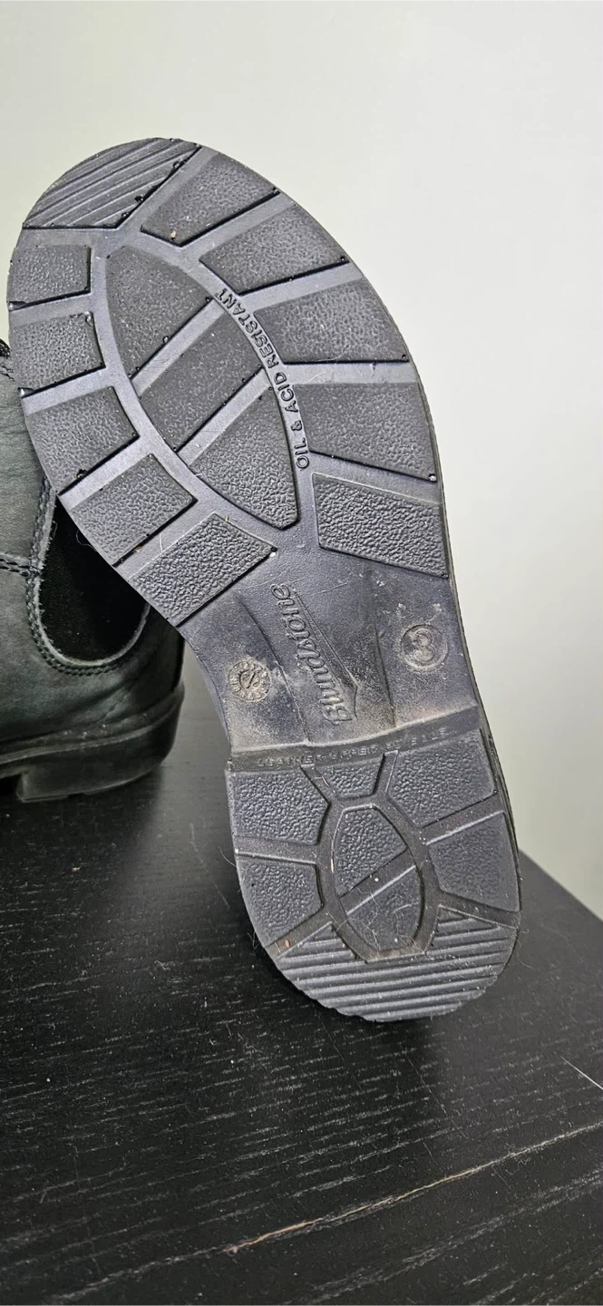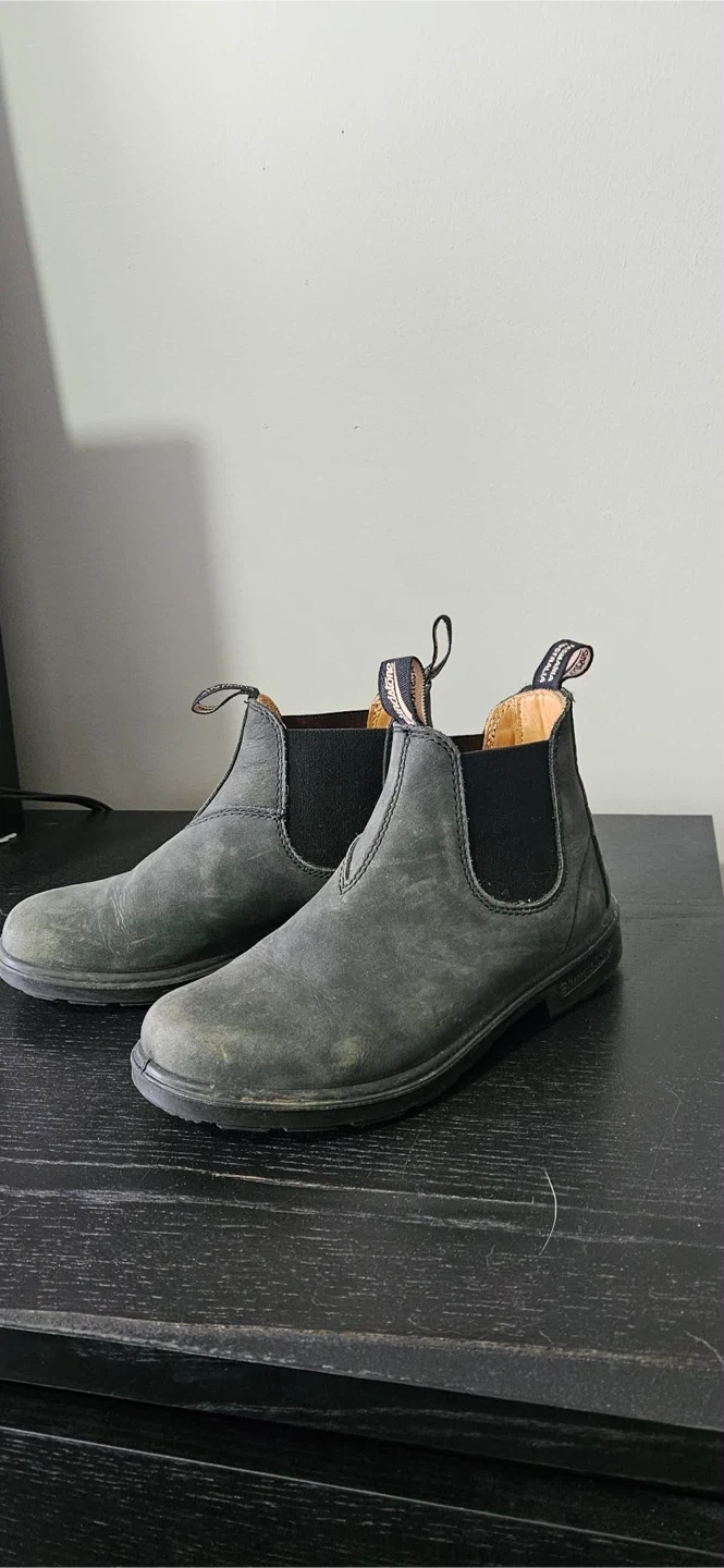 Blundstone #1325 kids' boots in rustic black. Water-resistant leather construction. These boots feature pull-on tabs and elastic side panels. Oil and acid resistant sole. Slightly dirty sole but will be cleaned before pickup!