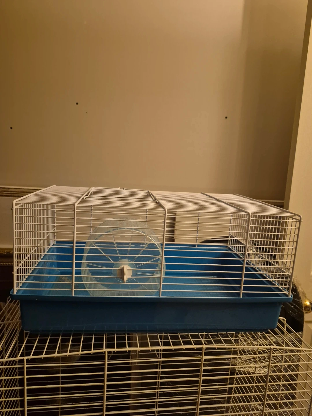 This is a white wire hamster cage with a blue plastic base. It includes a clear plastic running wheel. Dimensions are approximately 18" x 12" x 10". Great for small pets!