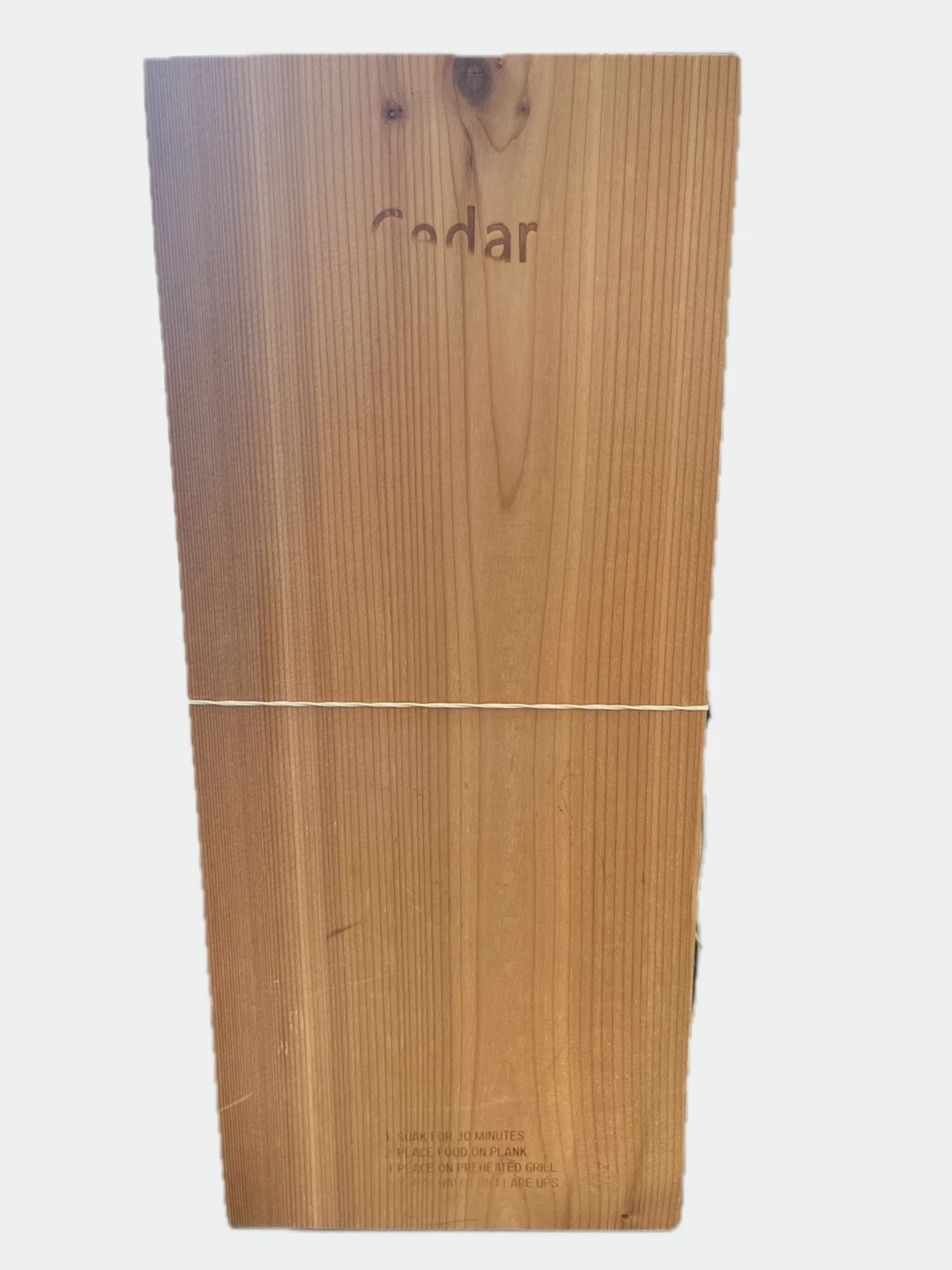 Cedar plank for grilling. Soak for 30 minutes before placing food on it. Then place on a preheated grill. Water on it prevents flare-ups!