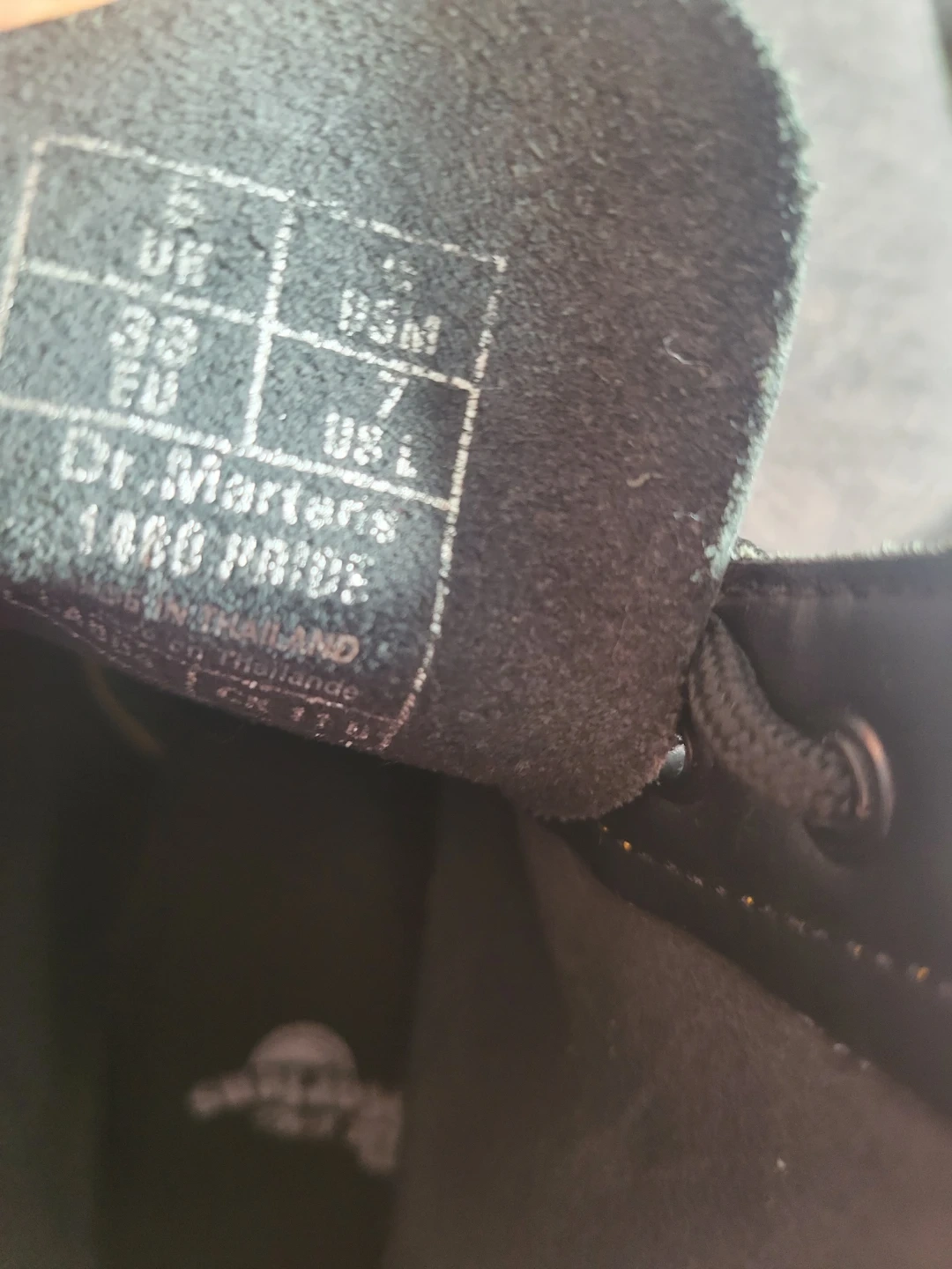 Dr. Martens 1460 combat boots. These feature the iconic rainbow stitching detail. Leather material with rubber sole. Manufactured in Thailand. They're a women's US size 7.missing one lace