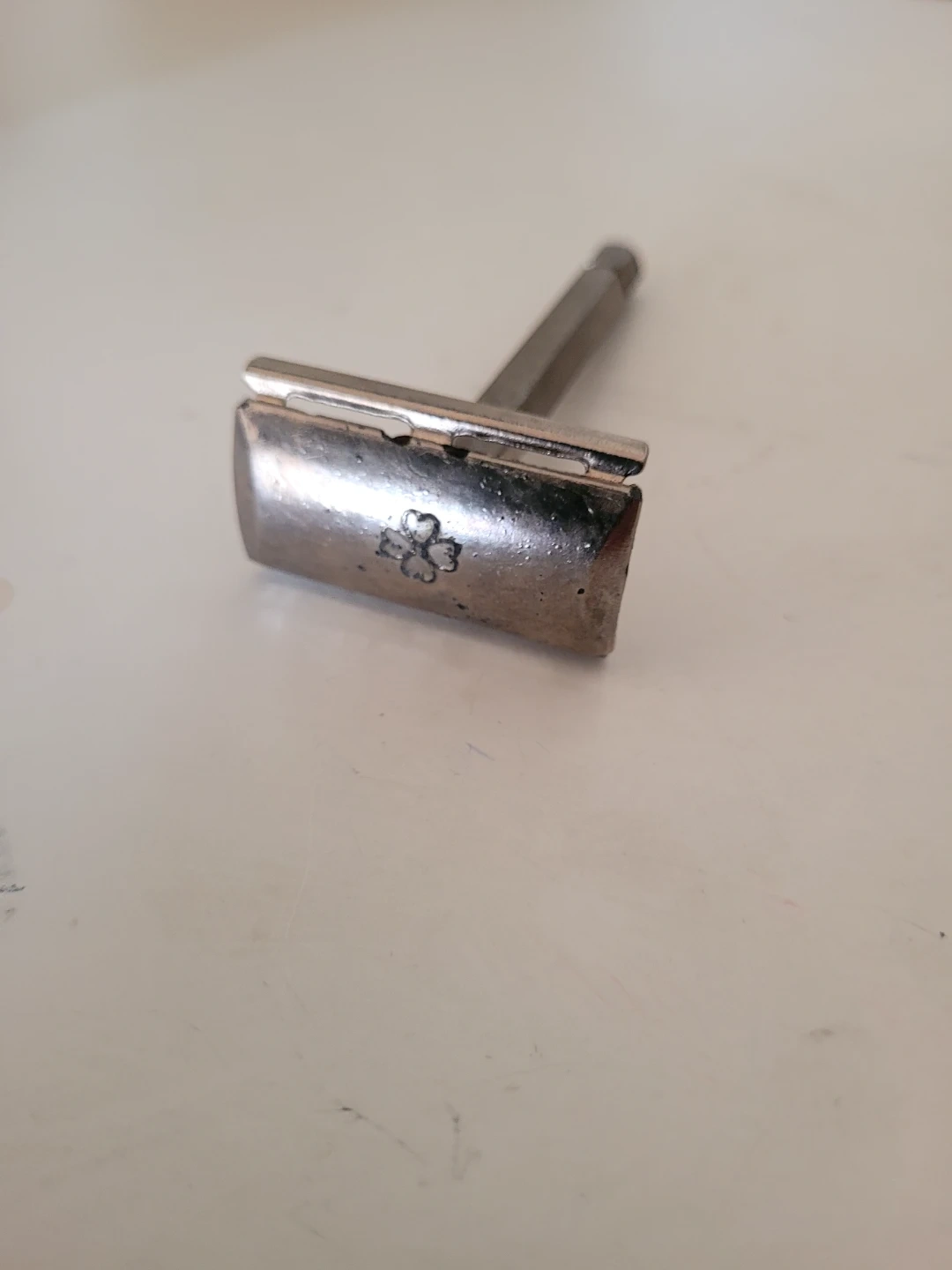 A classic metal safety razor with a unique clover design. It features a standard hex handle for easy grip. This razor is perfect for a smooth shave.