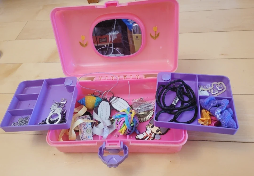 Caboodle pink plastic storage box with a purple handle and clasp, perfect for organizing craft supplies or jewellery. It has multiple compartments to keep items tidy. The lid opens to reveal a mirror.