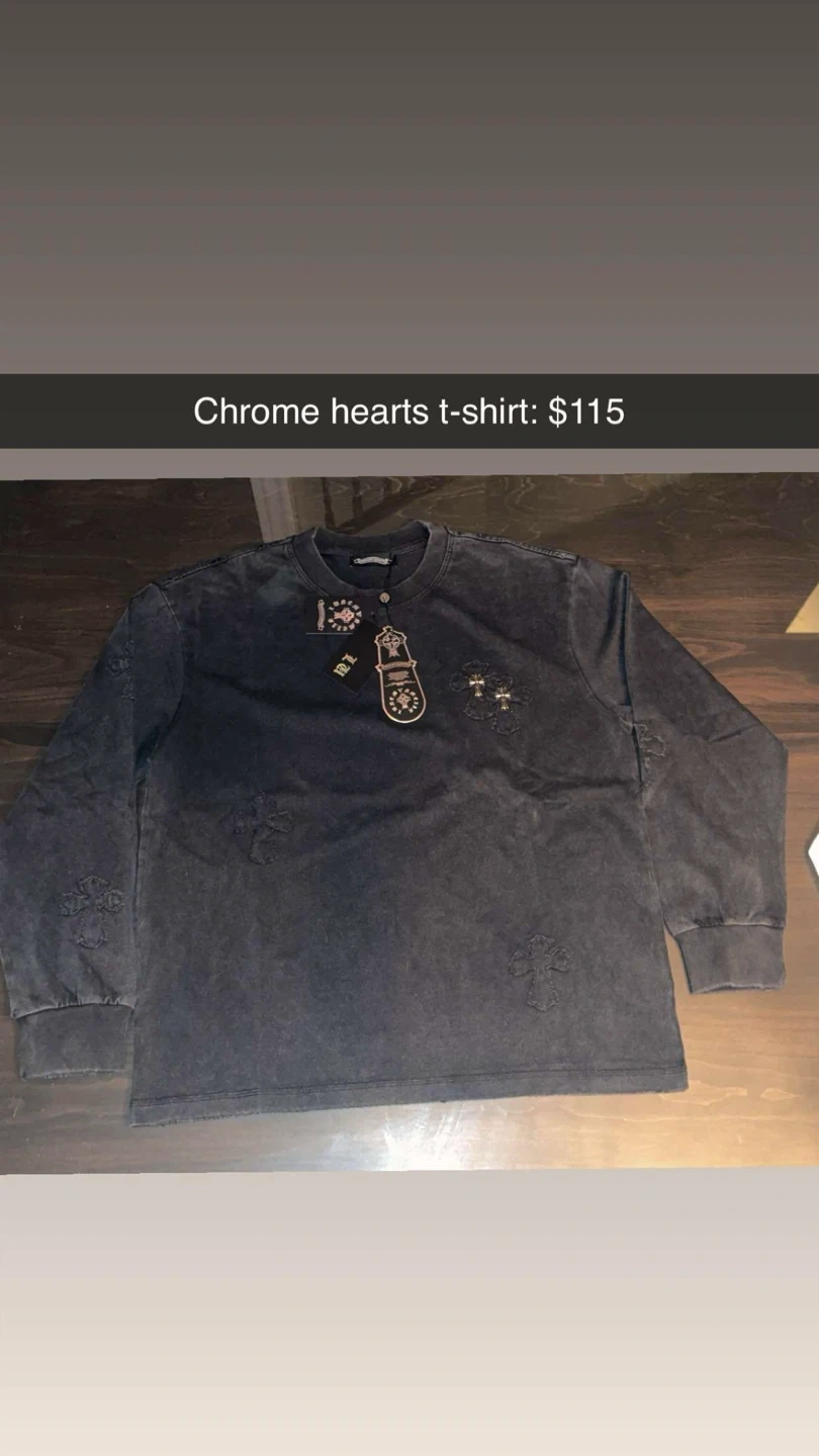 This is a long sleeve Chrome Hearts t-shirt. It features the brand's signature cross motifs printed and embroidered across the fabric. The shirt has a washed black colour.