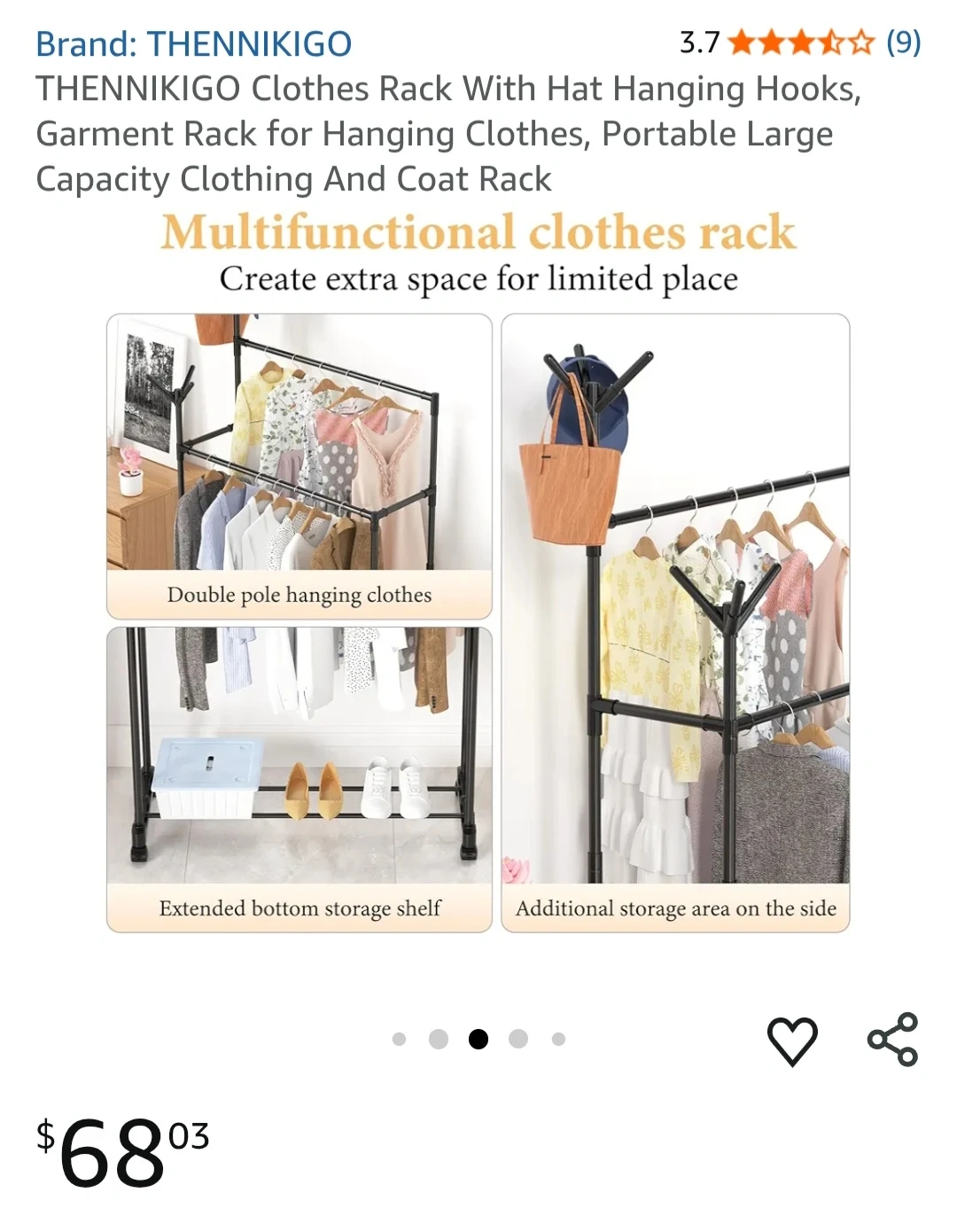 This THENNIkIGO clothes rack offers a double pole for hanging clothes and an extended bottom shelf for storage. It also has additional storage on the side for hats or bags. It's perfect for keeping your garments and accessories organized.