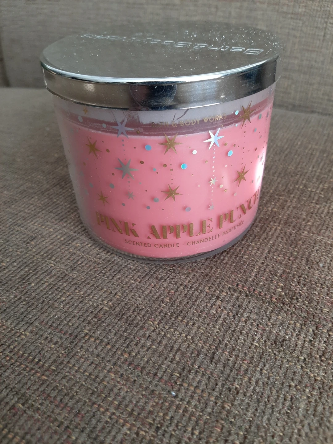 This is a BN Bath & Body Works "Pink Apple Punch" scented candle. It's a large three-wick candle in a glass jar with a metallic lid. The candle is pink with gold star accents.