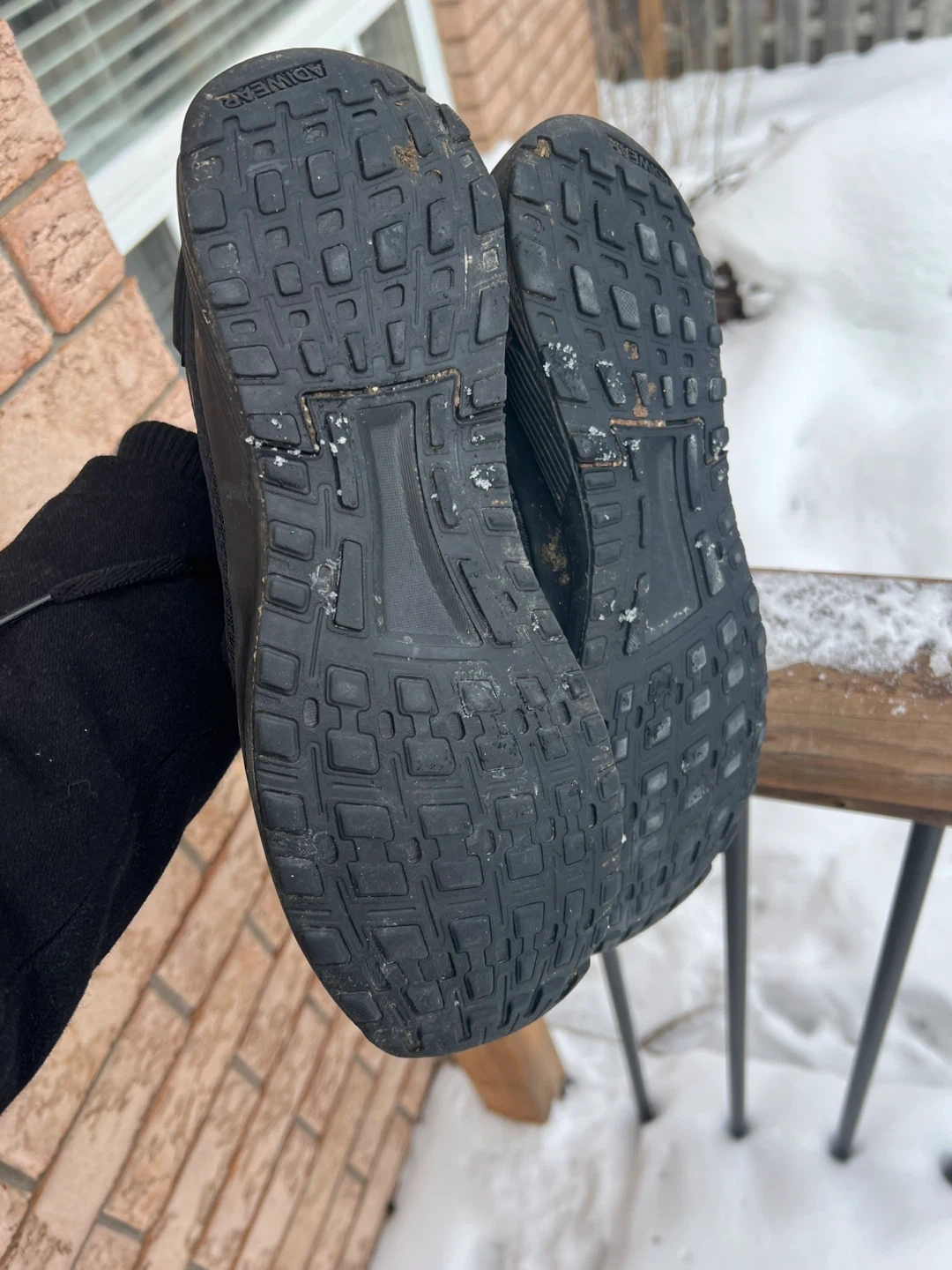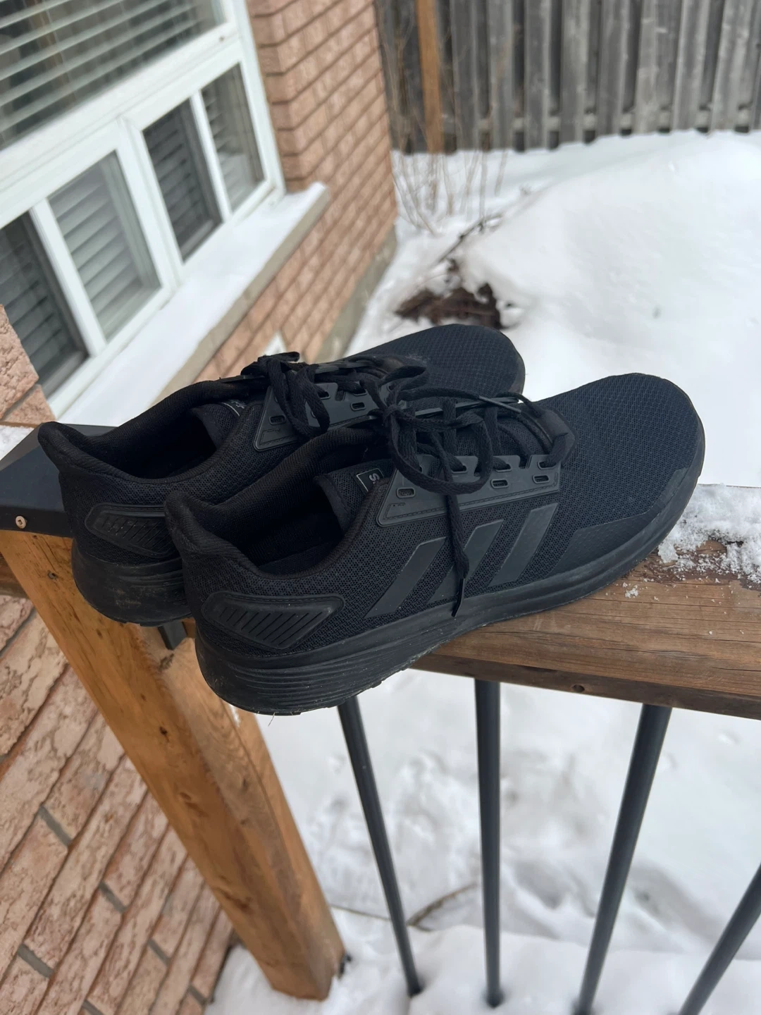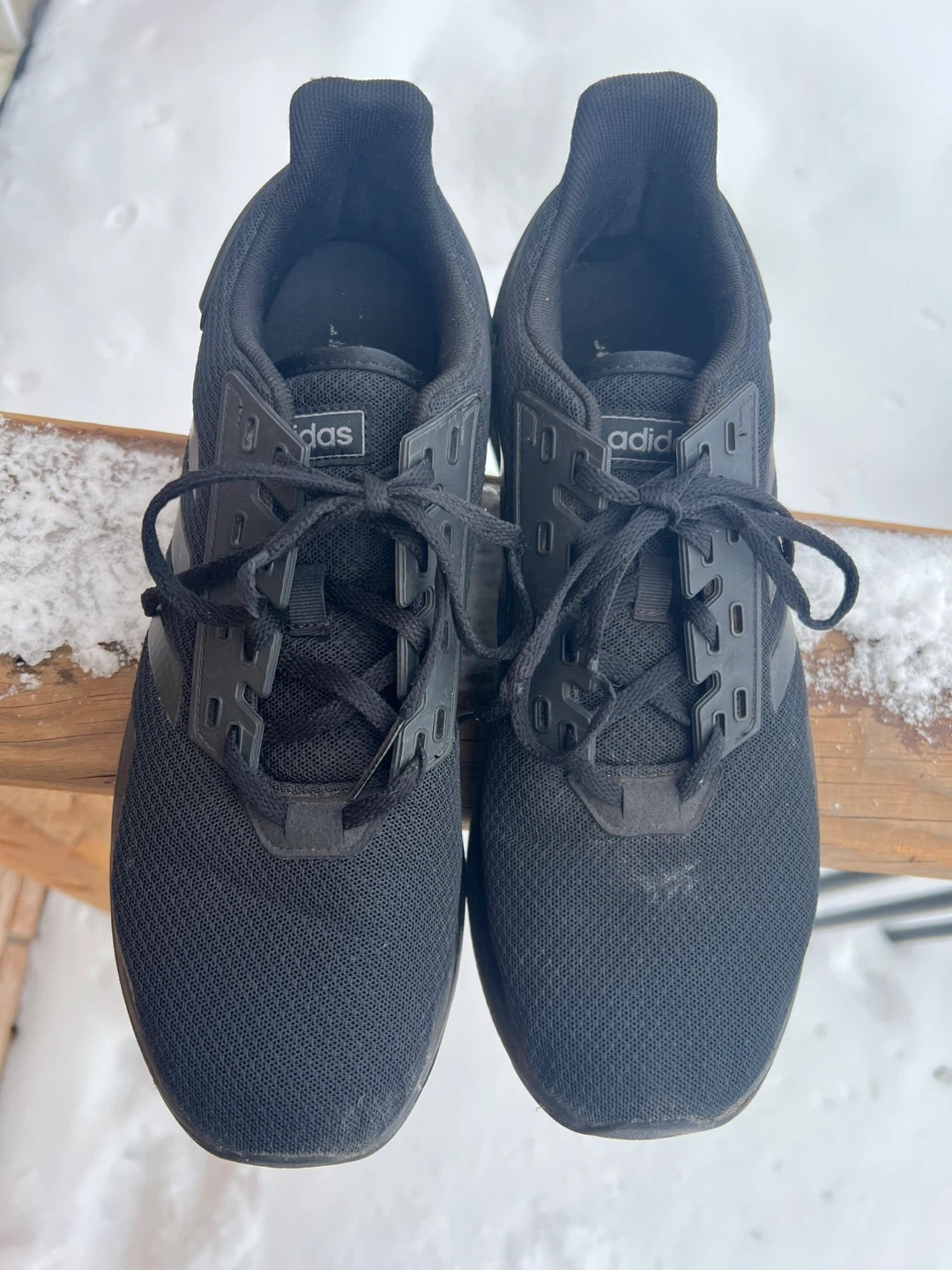 Black Adidas running shoes with a mesh upper and rubber sole. These shoes are designed for athletic activities. They're suitable for running or everyday wear.