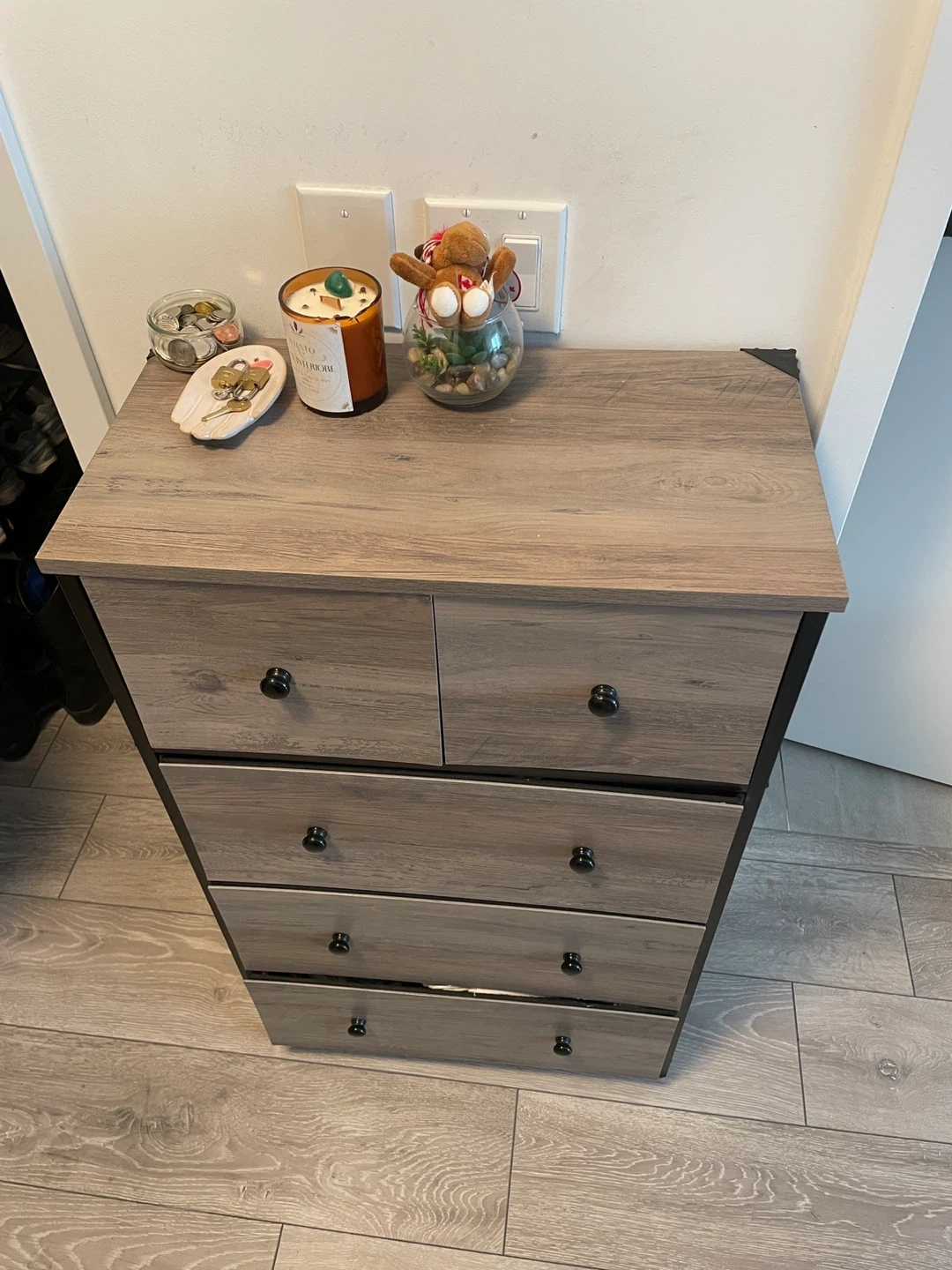 This dresser features a wood grain finish with a black metal frame. It has two smaller drawers at the top and three larger drawers below, with black pull handles. The fabric side panels add a modern touch. We’re selling a dresser in good condition for $80.