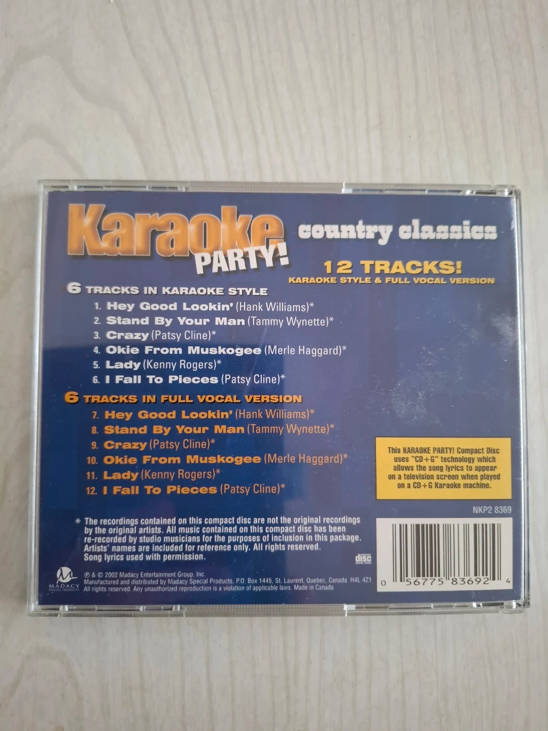This CD features 12 tracks of country classics for karaoke. It includes 6 tracks in karaoke style and 6 tracks in full vocal version. A lyric book is included. These recordings contain original artist versions.