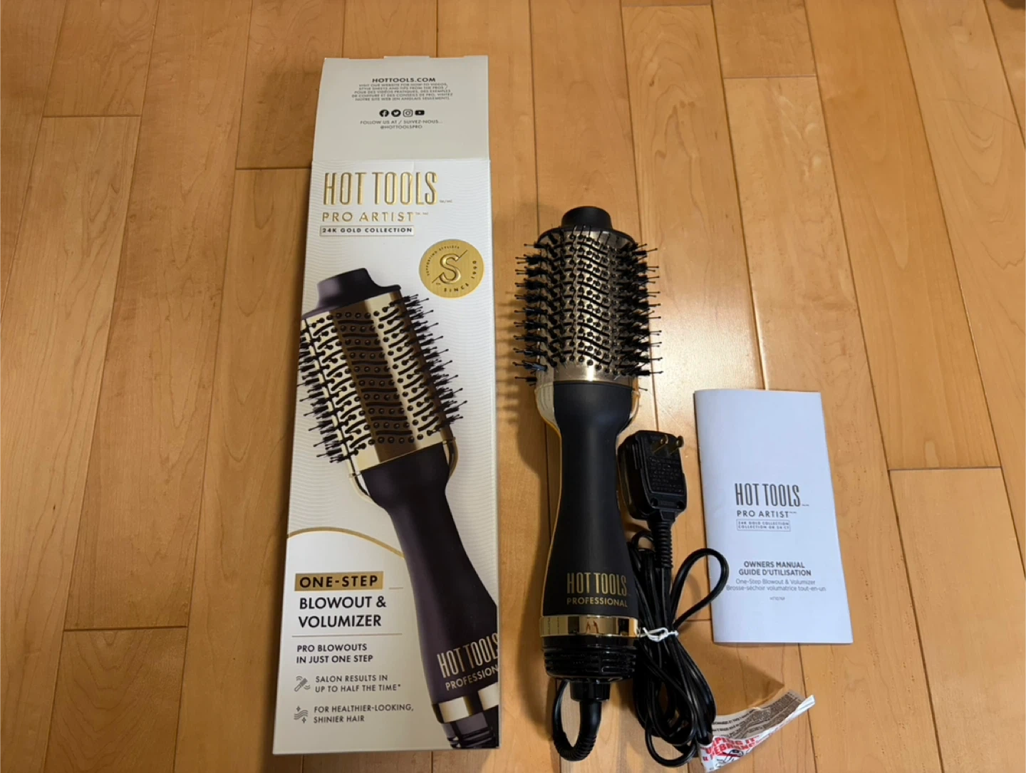 Hot Tools Pro Artist 24K Gold Collection One-Step Blowout & Volumizer. It's designed for faster, smoother styling. Includes owner's manual. It has Boartech bristles and 24K gold surface for even heat.