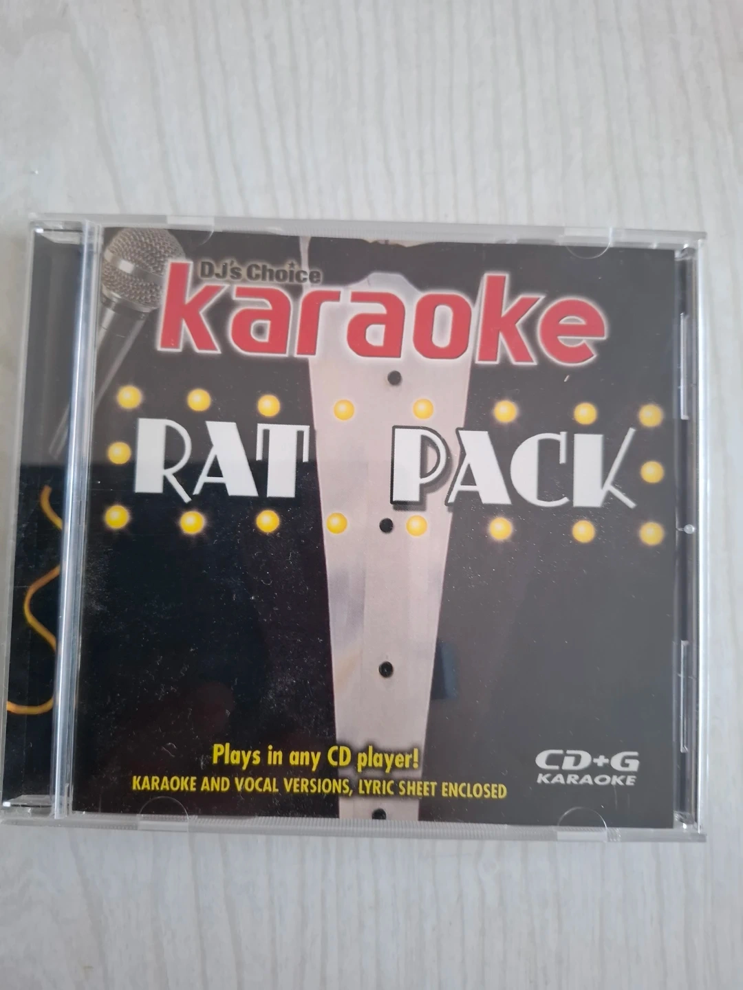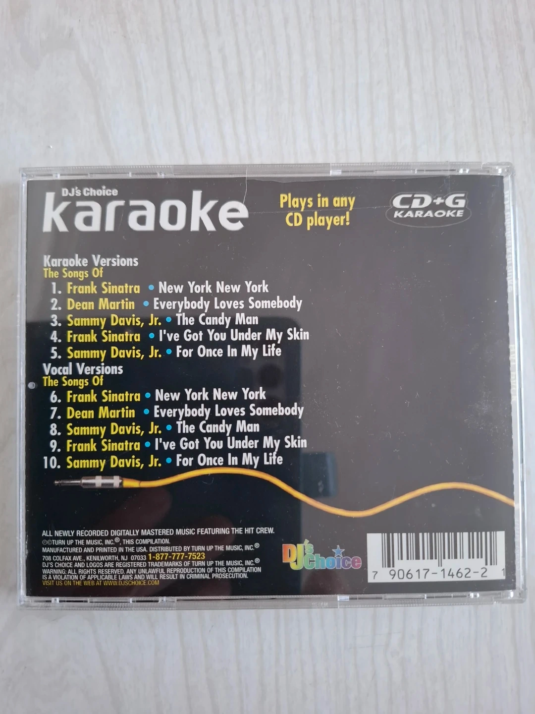 This DJ's Choice Karaoke CD features "The Rat Pack" with both karaoke and vocal versions of songs by Frank Sinatra, Dean Martin, and Sammy Davis, Jr. It plays in any CD player and includes a lyric sheet. The CD has been digitally mastered with the Hit Crew.