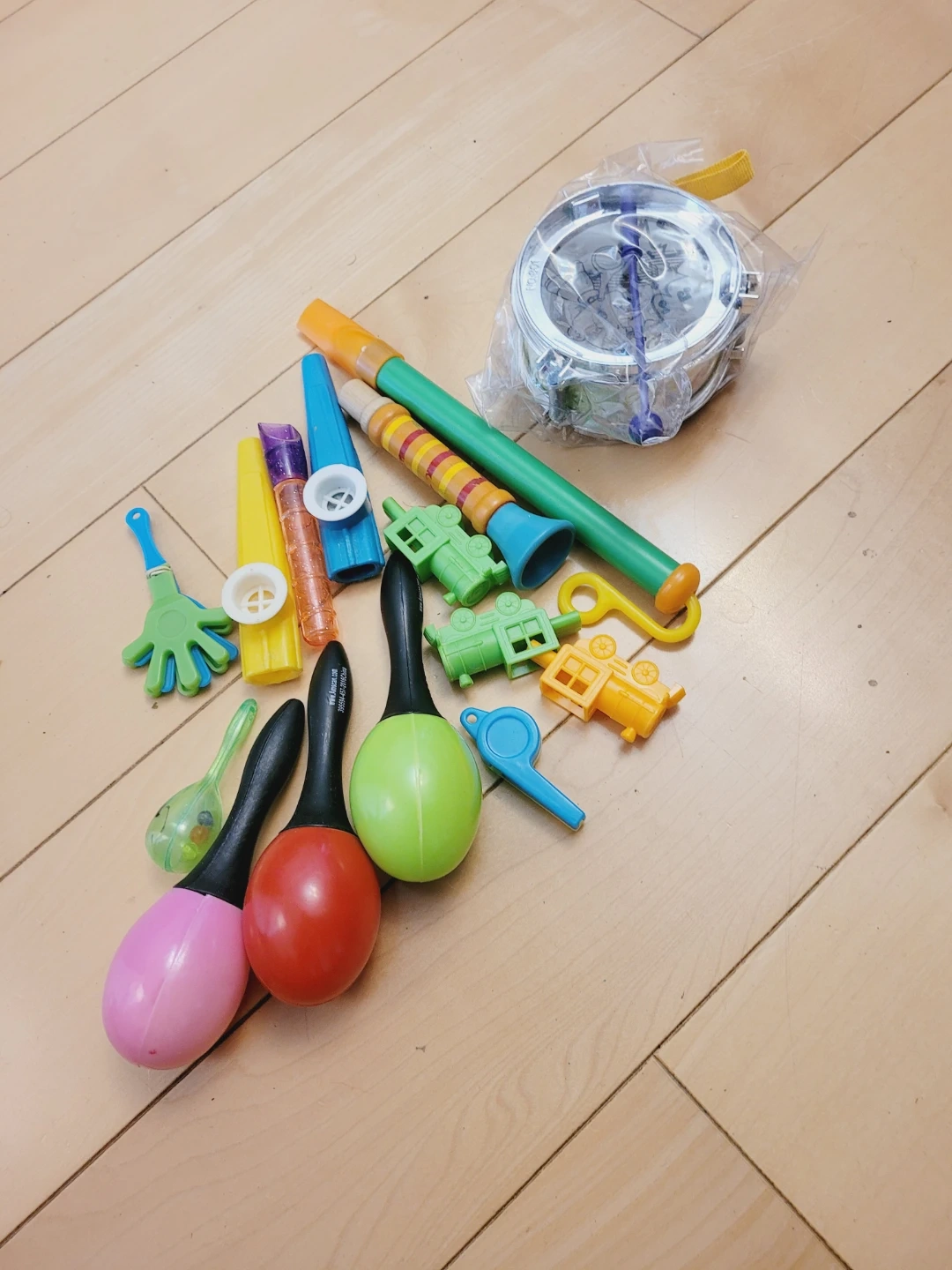 This is a fun collection of children's toys including musical instruments like maracas, a drum, and a kazoo, along with small train whistles. They're great for young kids to explore sound and imaginative play.