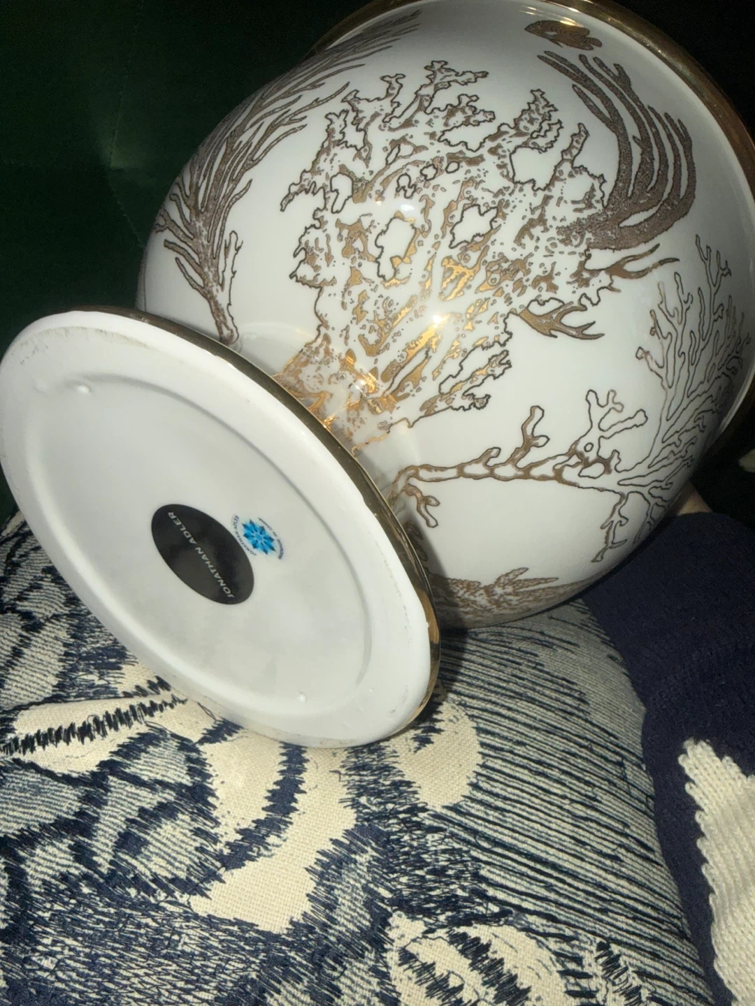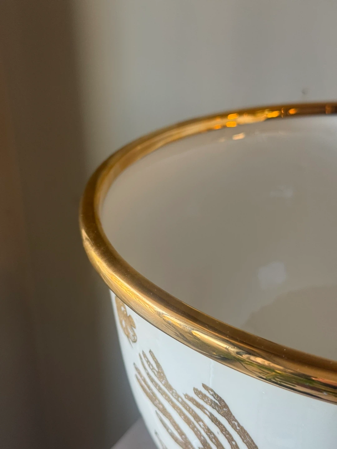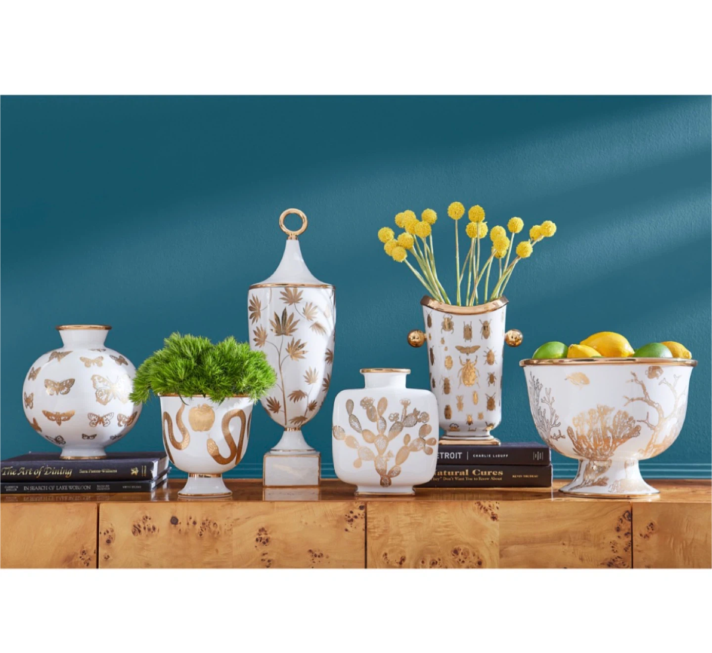 Jonathan Adler Botanist Coral Large pedestal bowl, it’s a generously sized porcelain centerpiece bowl, wrapped in shimmering gold silhouettes and finished with a glossy touch. A rich hippie must-have for your table, console, or counter. Retailed for $450+Tax