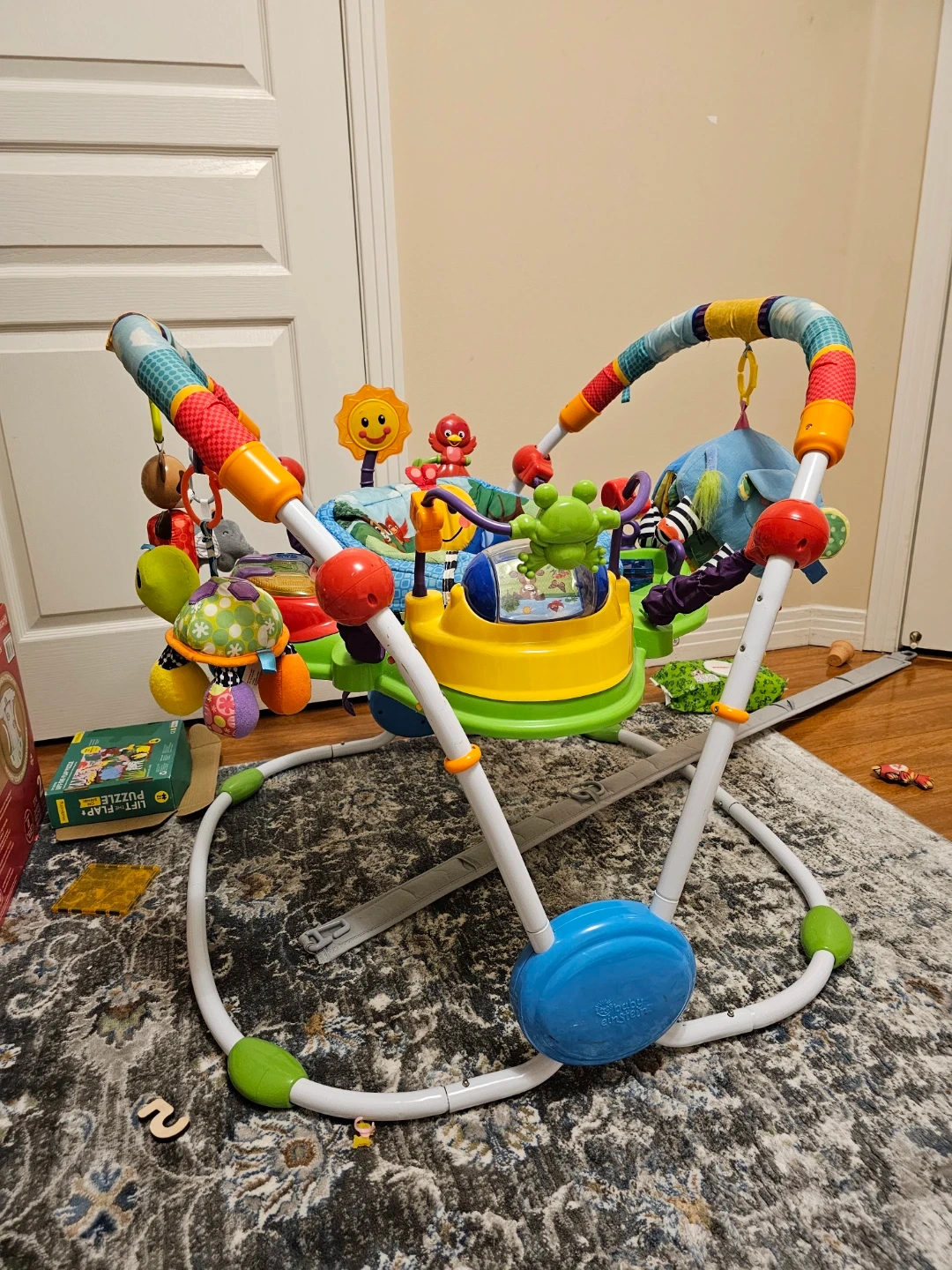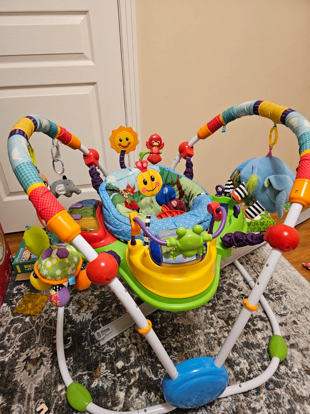 This colourful musical jumper features multiple engaging toys and activities for baby's entertainment. It has a spinning seat and a sturdy frame for playtime fun. Great for keeping little ones occupied!