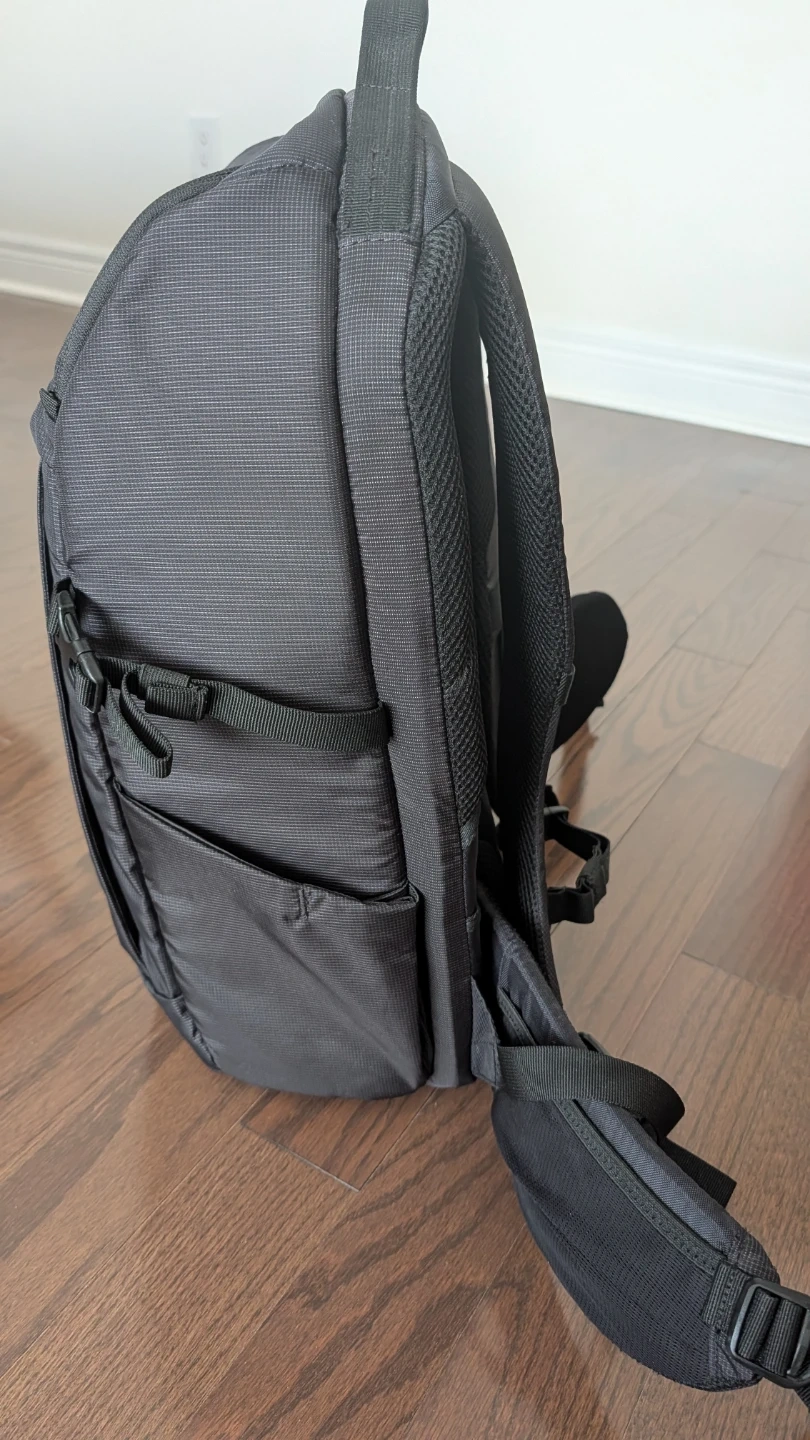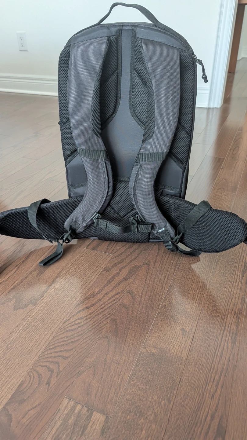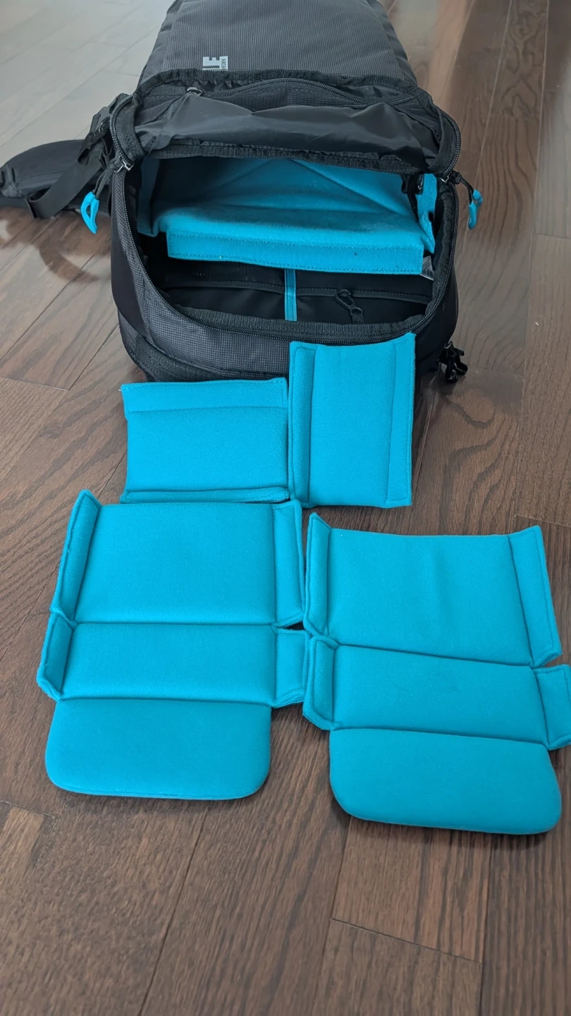 This is a Thule black backpack, it comes with adjustable padded inserts for organization. The backpack has a main compartment and multiple external pockets for easy access. It's designed for comfort with padded shoulder straps and a back panel.