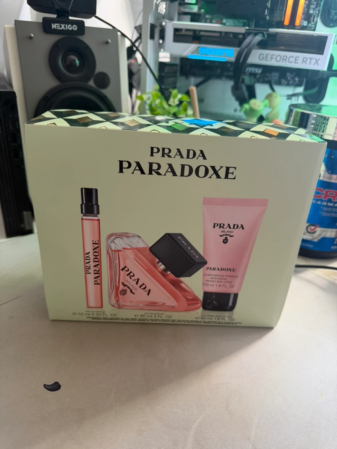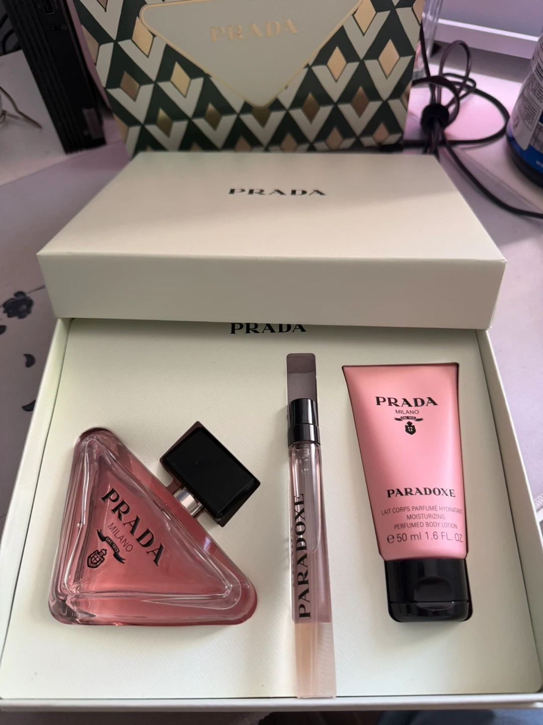 This gift set features Prada Paradoxe Eau de Parfum in a 90ml bottle and a 50ml body lotion. It also includes a 10ml travel spray. The set comes in its original packaging.