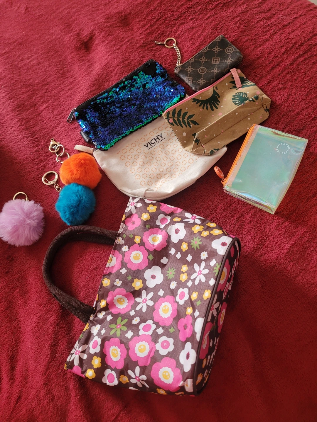 This lot includes a floral tote bag, a Vichy cosmetic bag, a green sequin pencil case, and several small coin purses and keychains. Some pouches have unique designs like holographic or leaf prints. They're great for organizing small items.