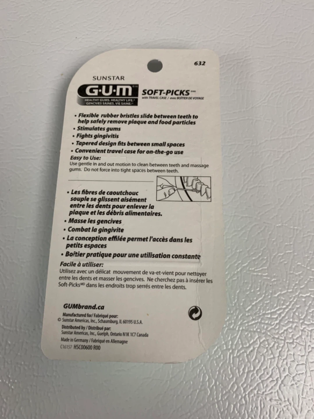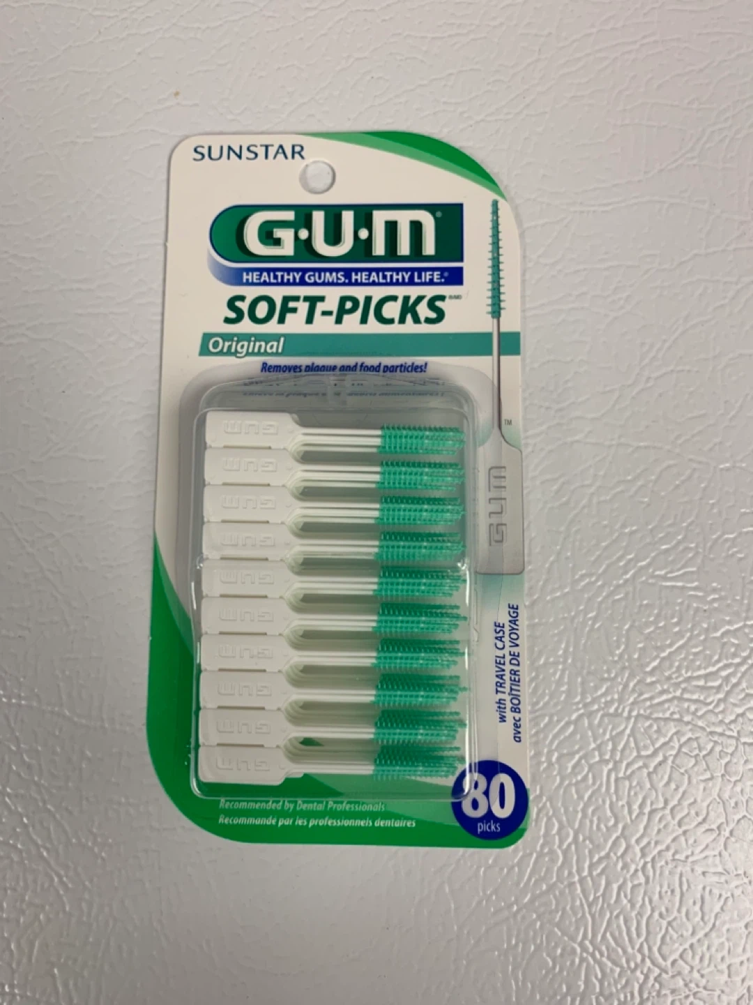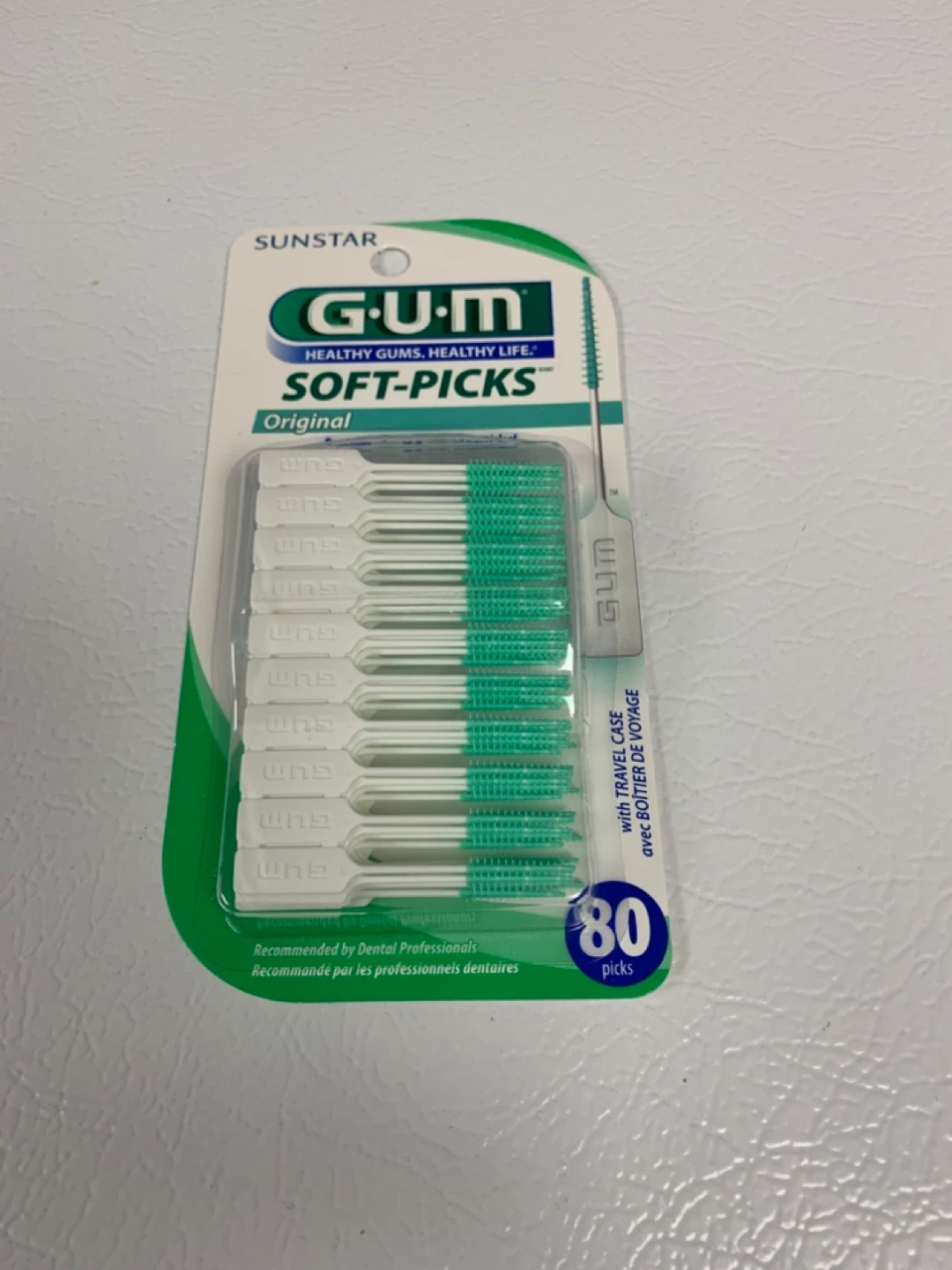New unopened G.U.M Soft-Picks Original come in a package of 80 picks. They feature flexible rubber bristles designed to slide between teeth and stimulate gums. A convenient travel case is included for on-the-go use.