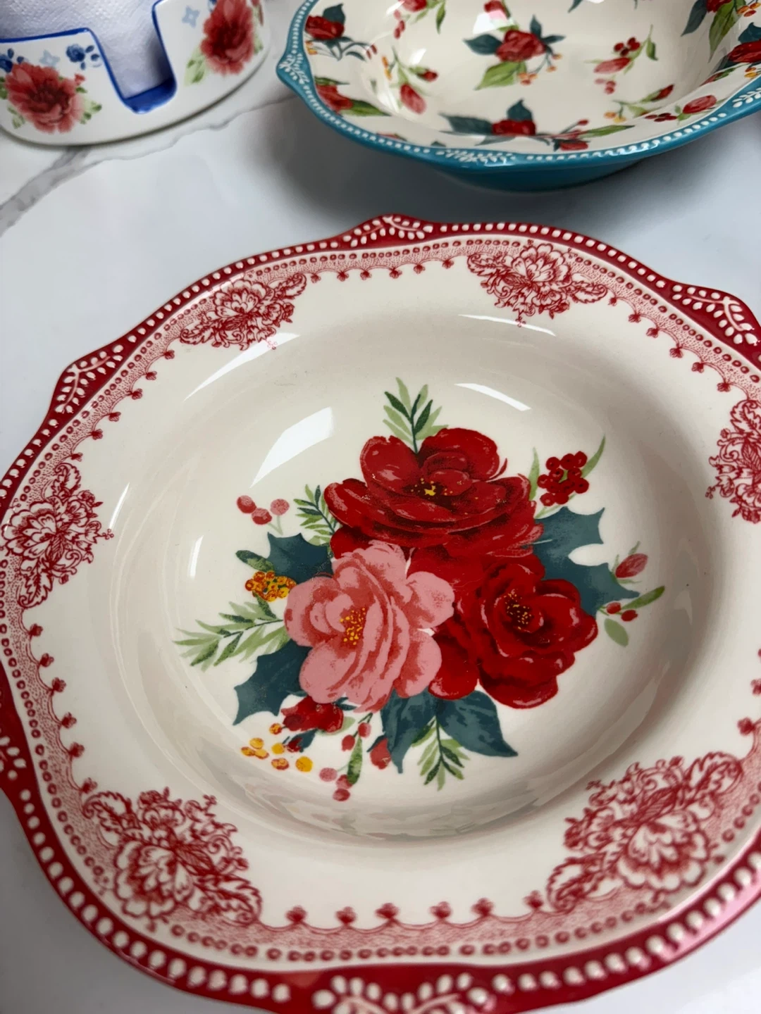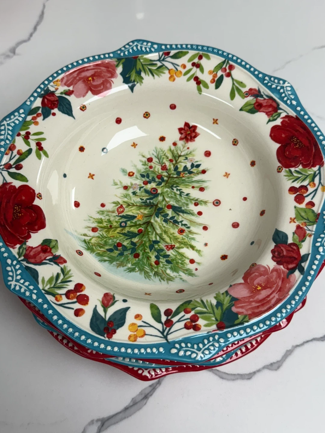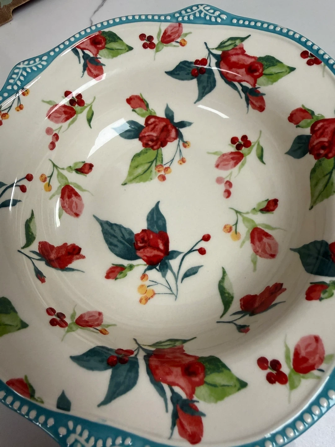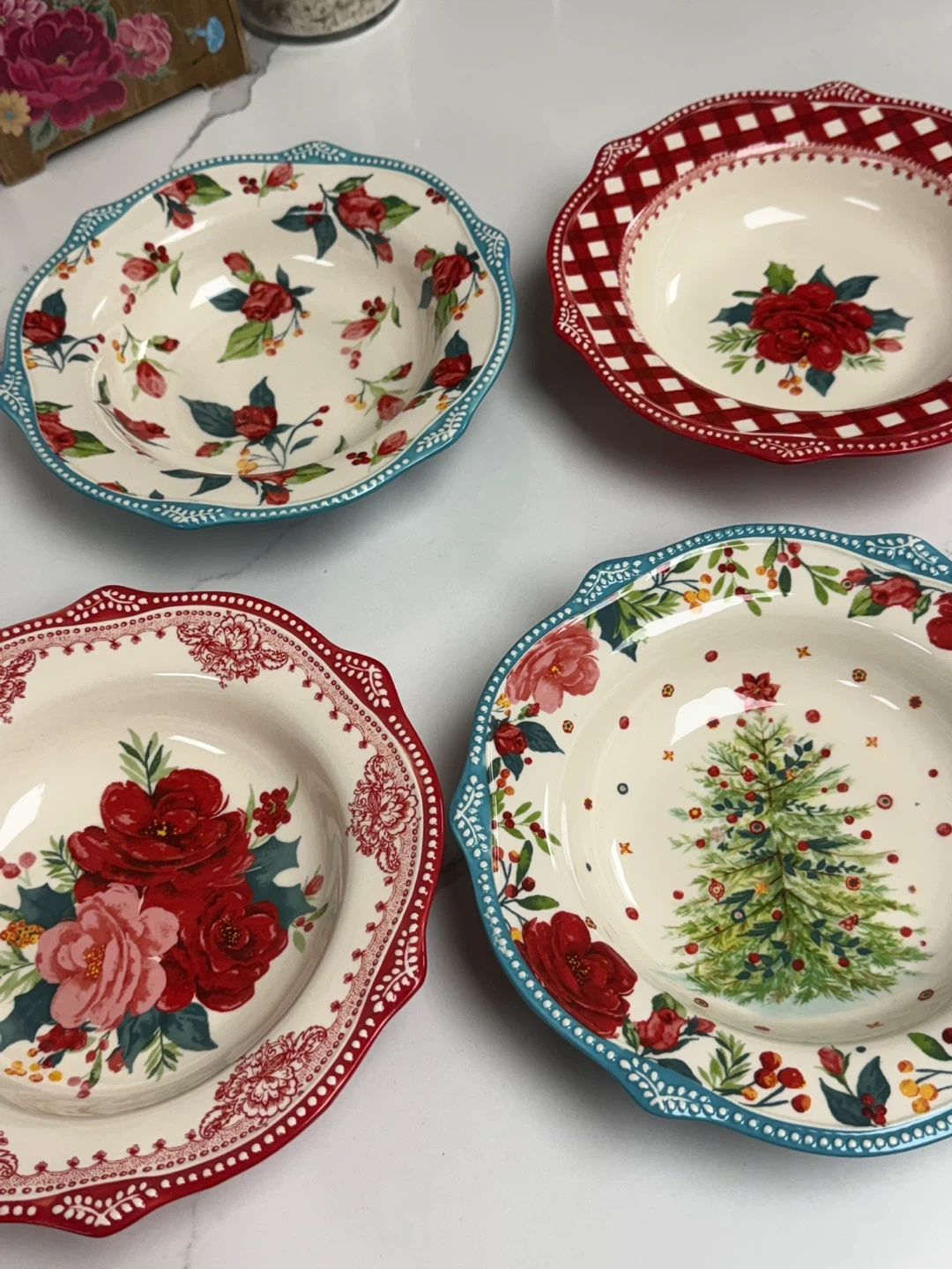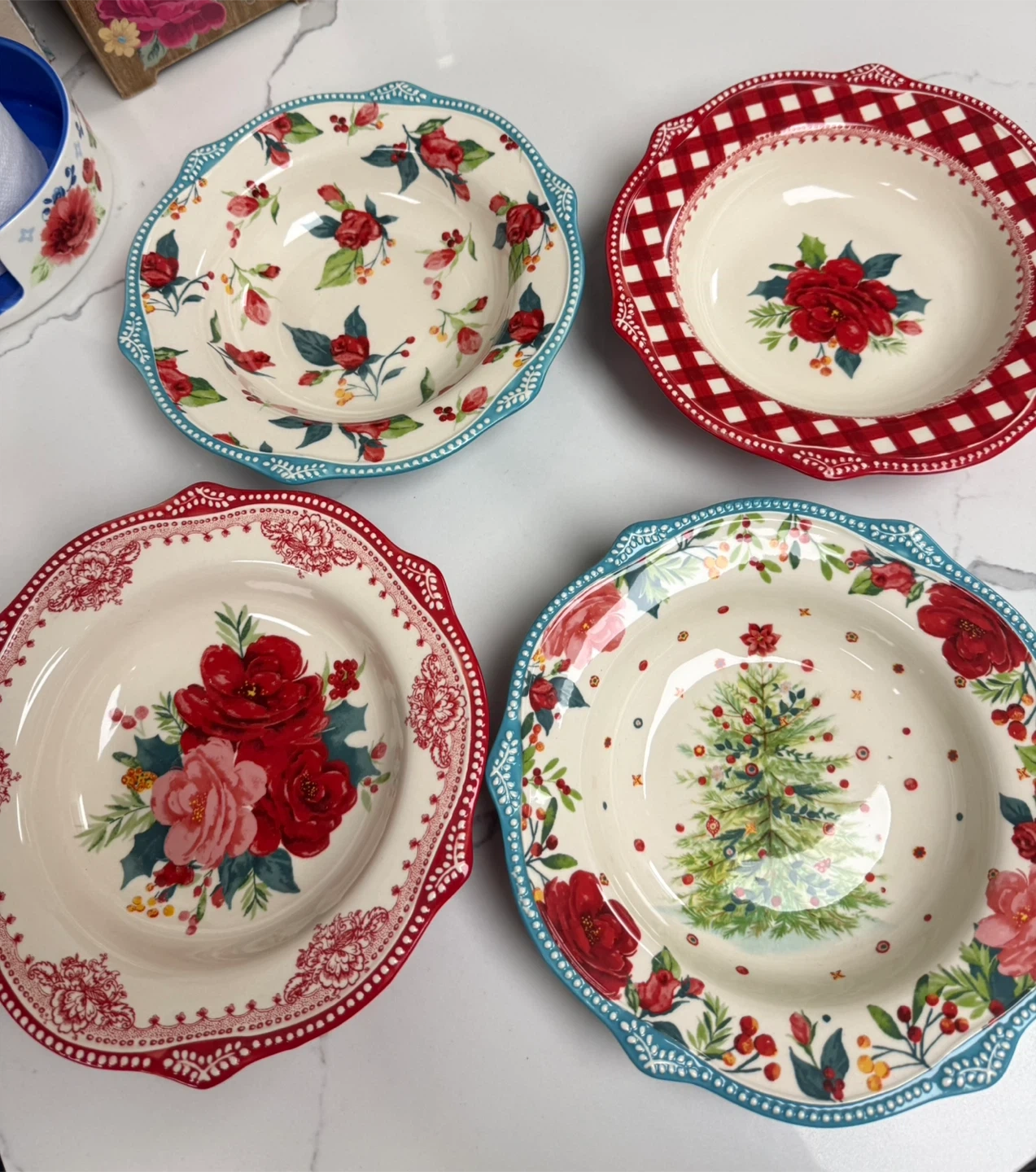 Set of four The Pioneer Woman Stoneware bowls. Each bowl features a unique floral or holiday design. They're perfect for serving soups, salads, or desserts!