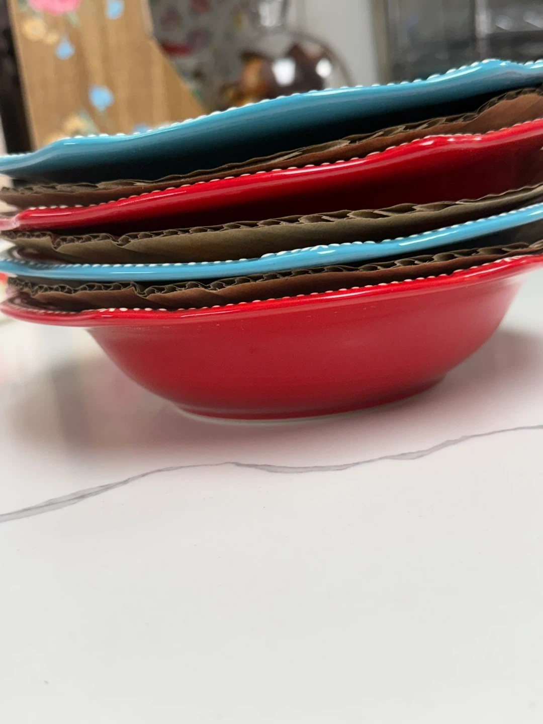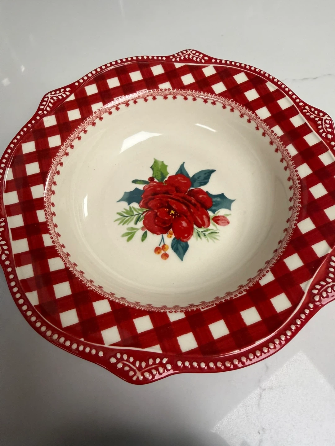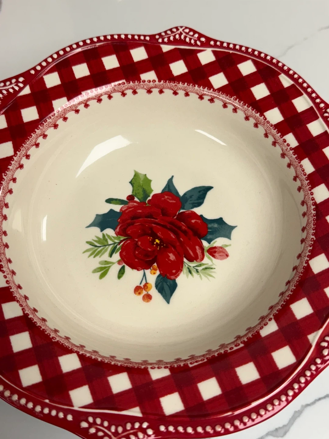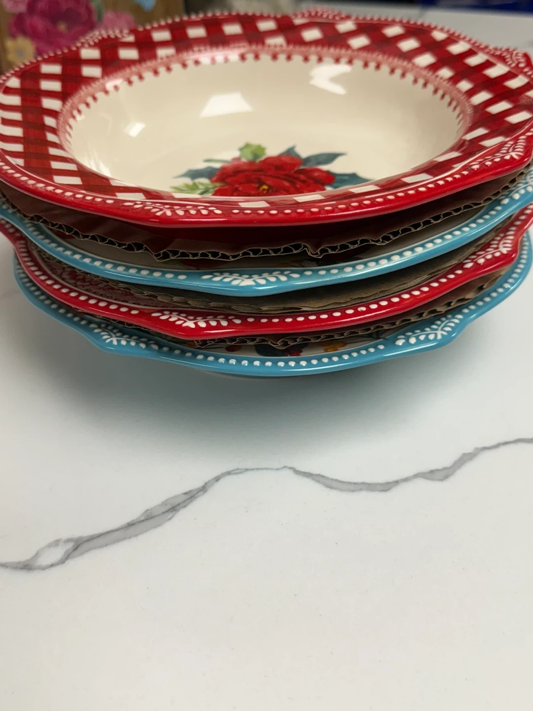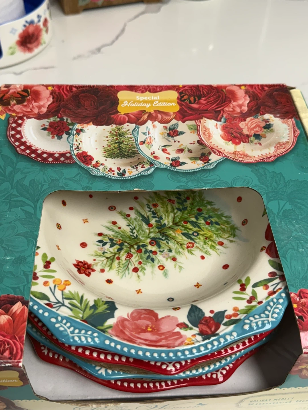 Set of four The Pioneer Woman Stoneware bowls. Each bowl features a unique floral or holiday design. They're perfect for serving soups, salads, or desserts!