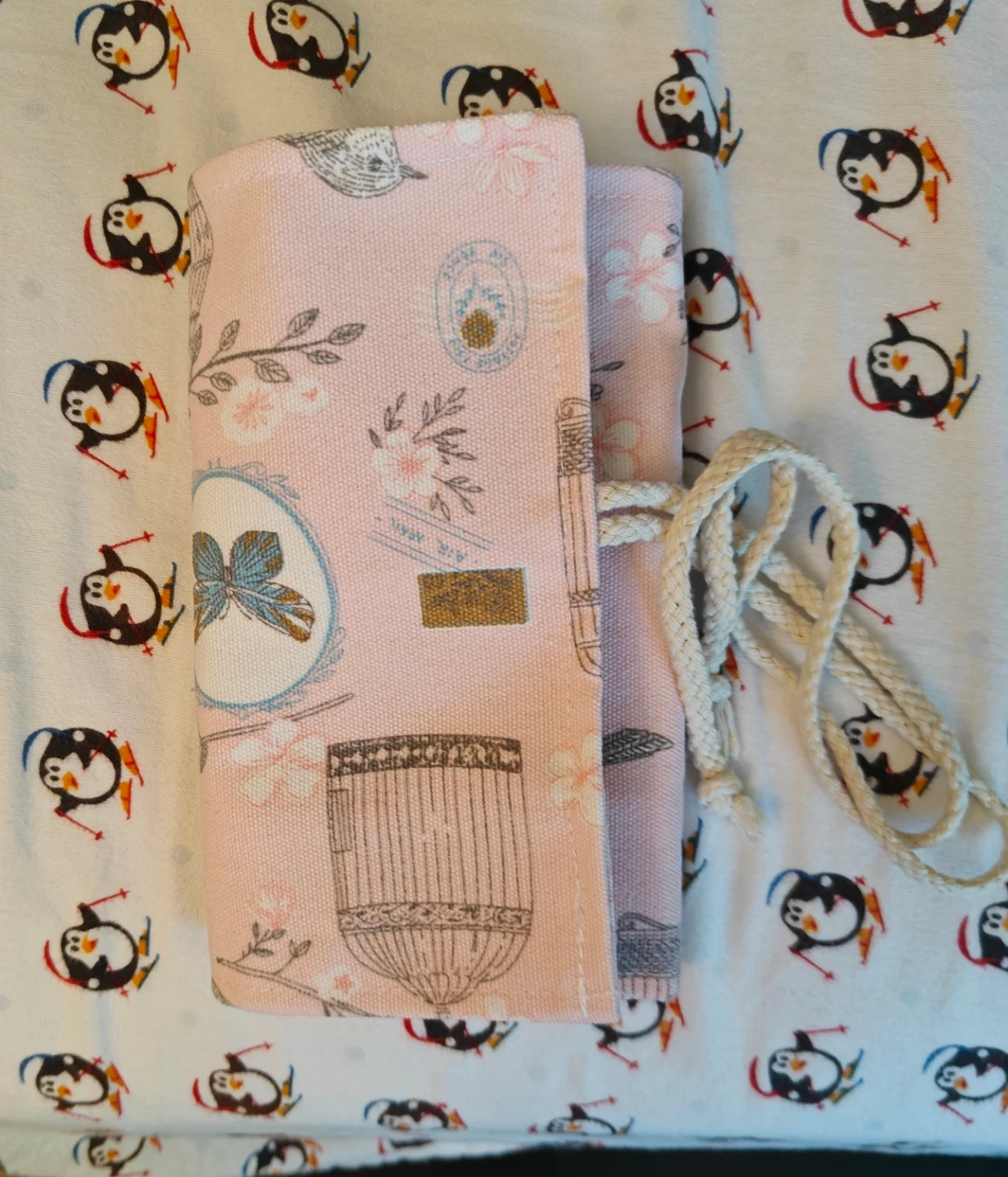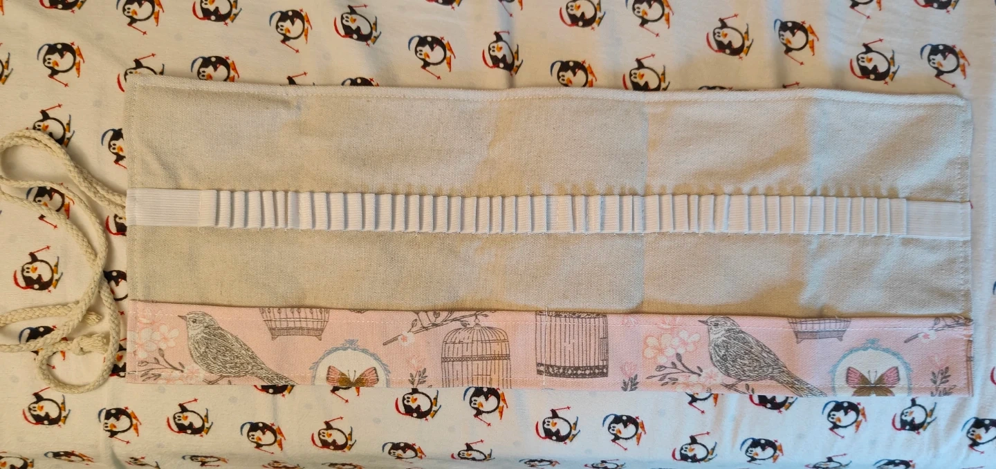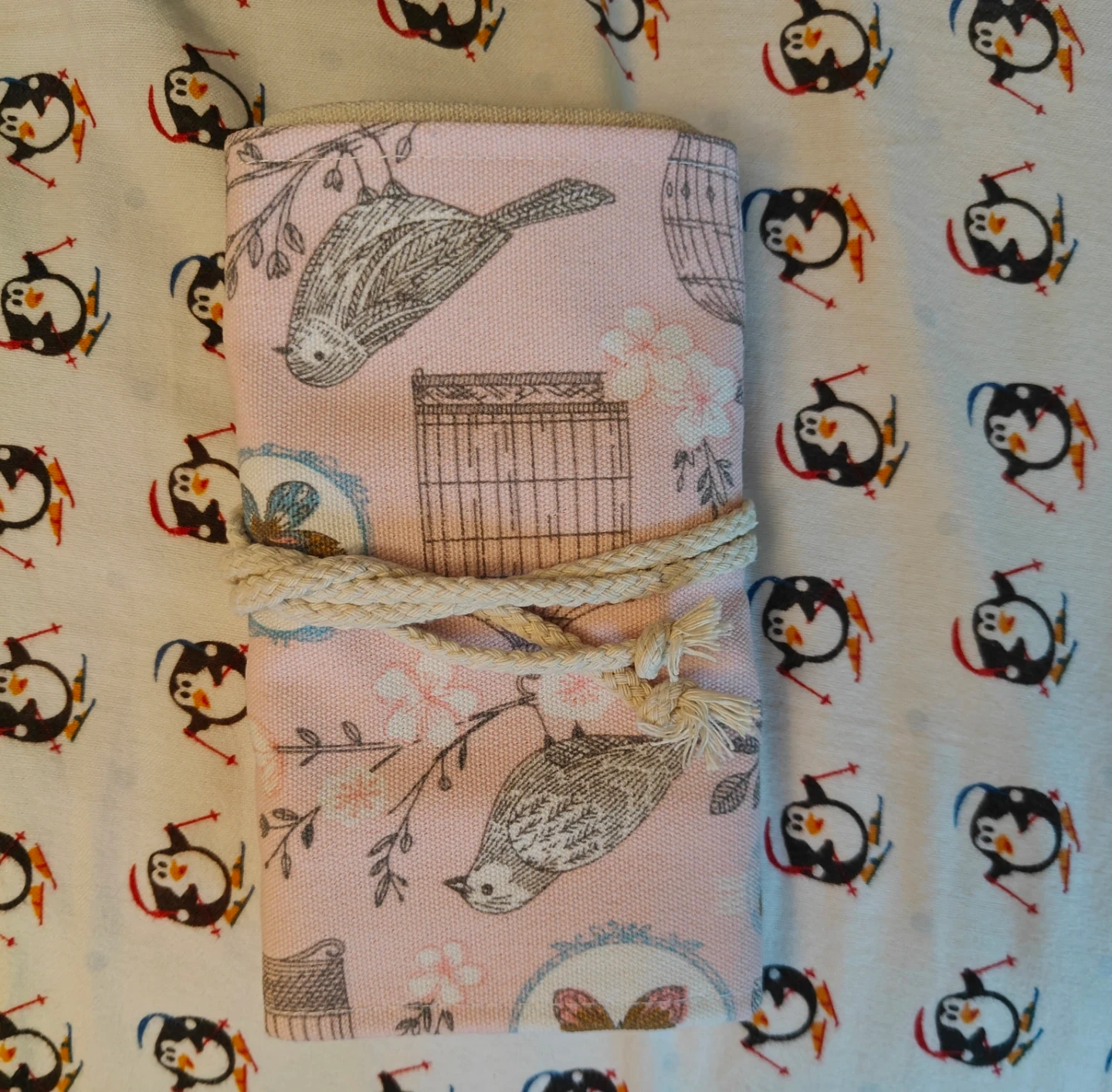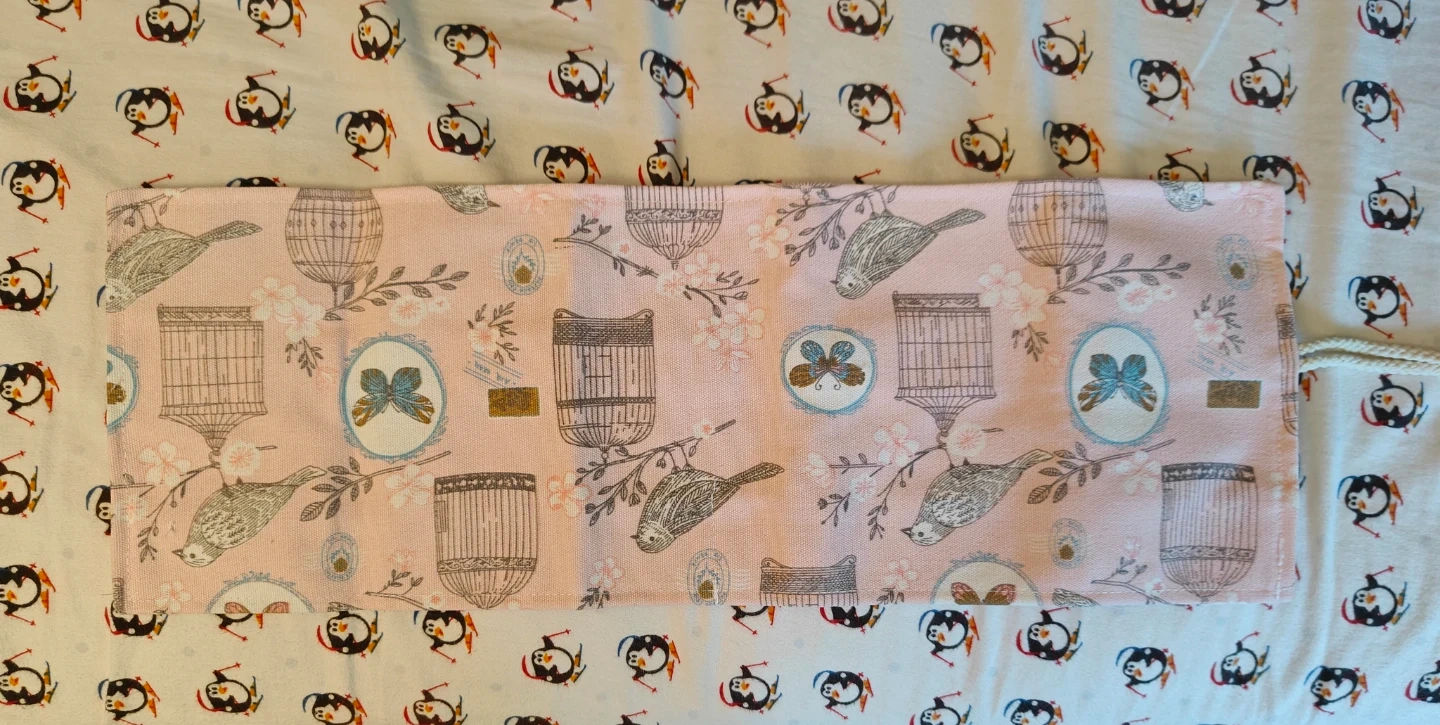 This fabric pencil roll case has a charming bird and cage print on the outside. It features elastic loops inside to hold pens or pencils securely. It's perfect for artists or students to keep their writing tools organized.