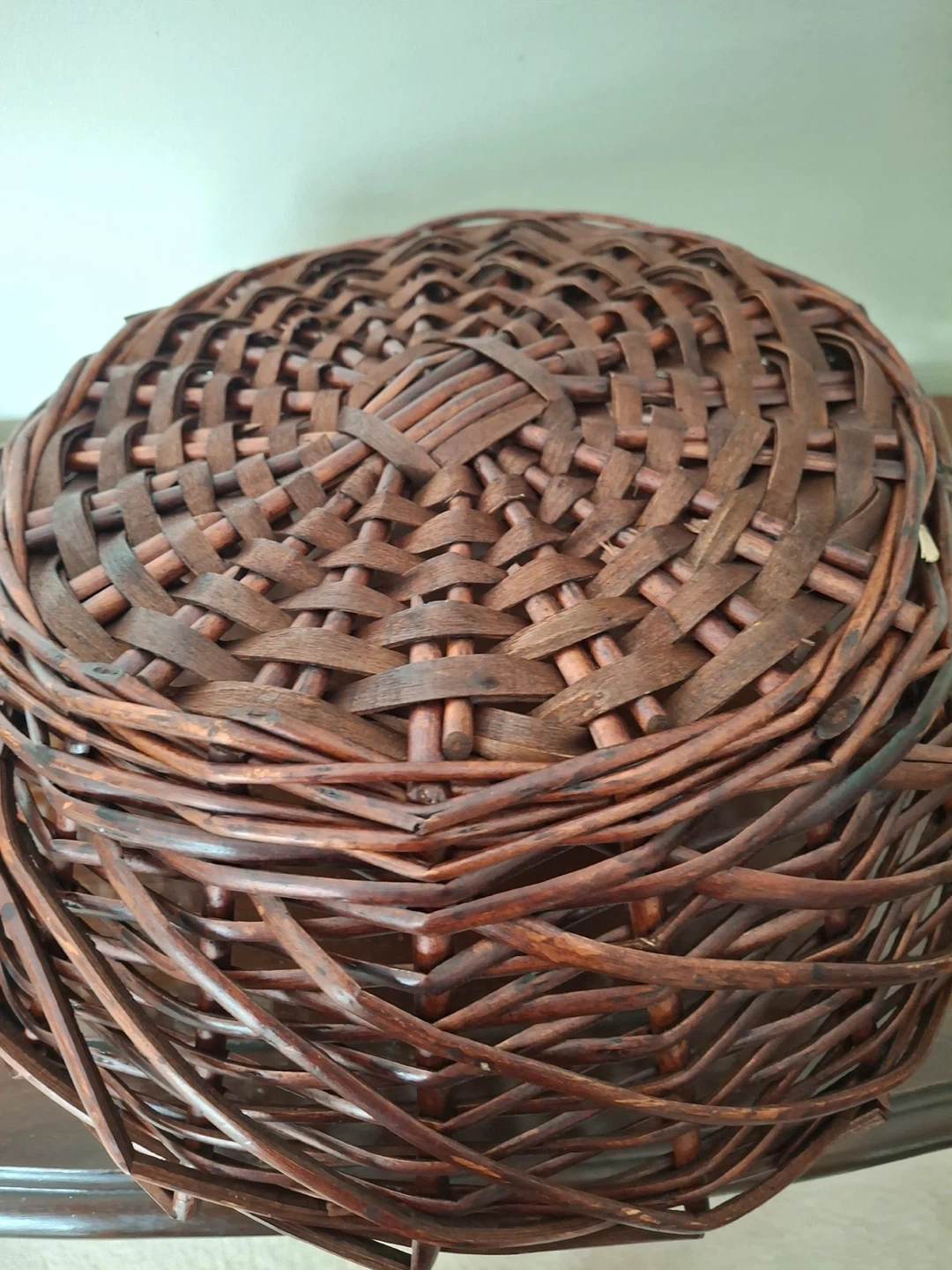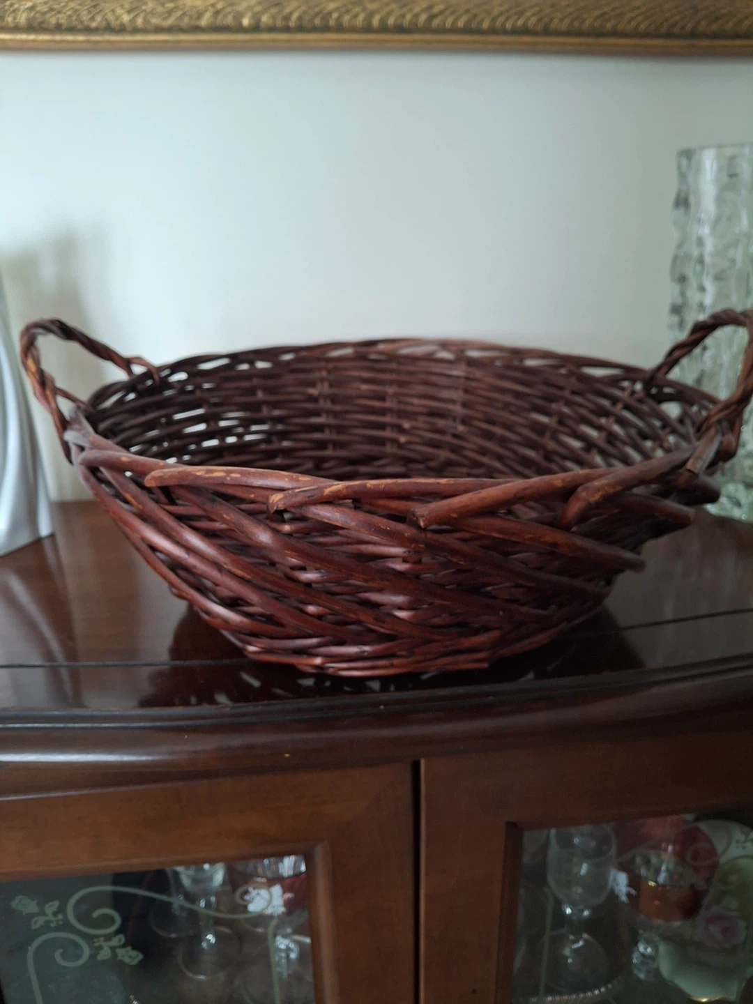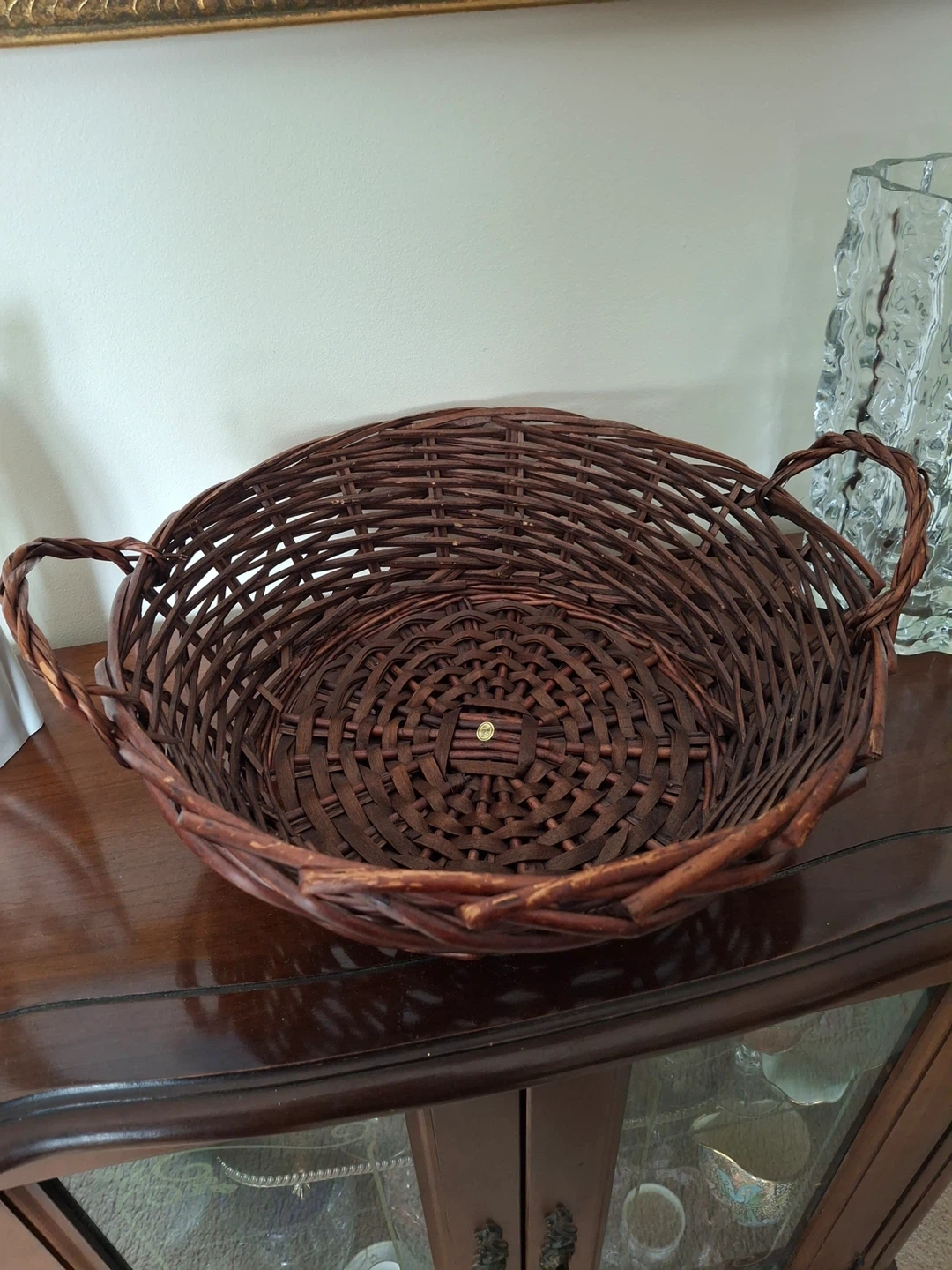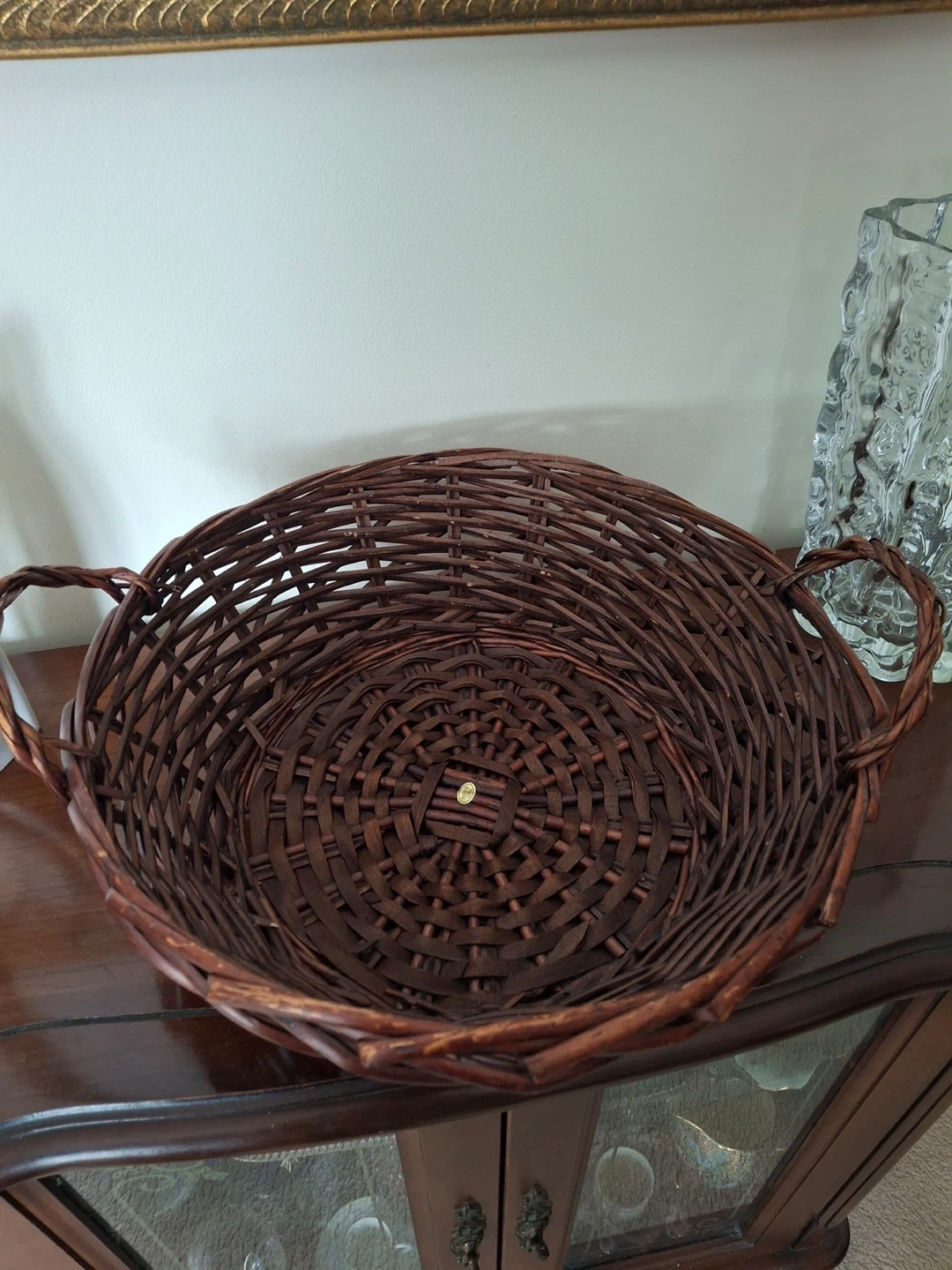 Dark brown woven basket with handles. Some wear/character markings (by design). 15” from handle to handle, x 12.75”. 5” deep. Great for assembling a gift basket.