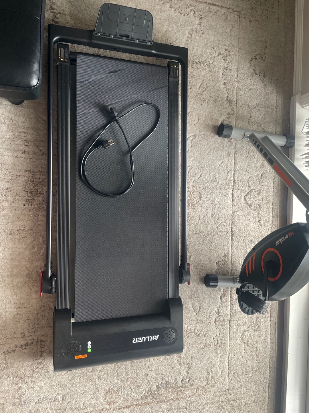 This is an Akluer folding treadmill. It's designed for home use and can be easily stored away. The treadmill is black and has a digital display.