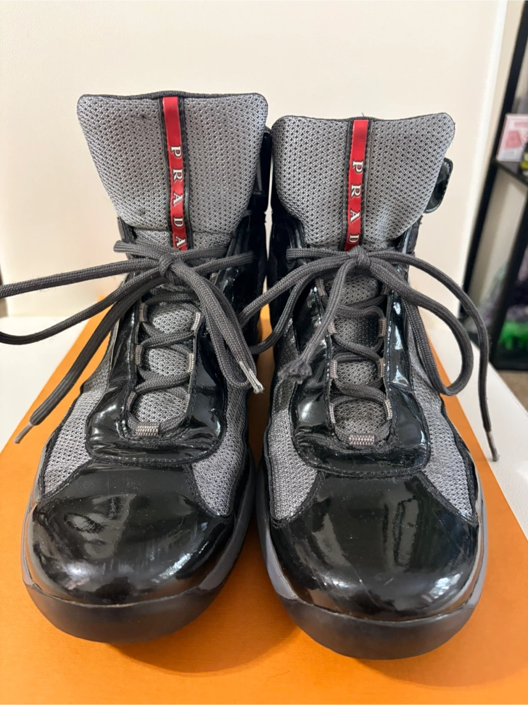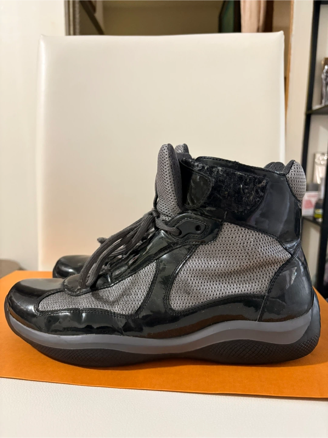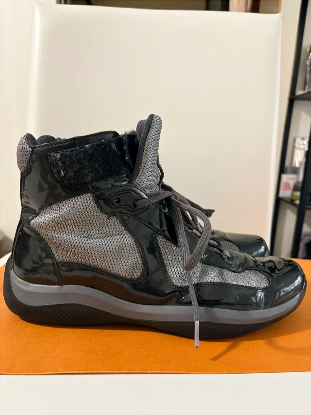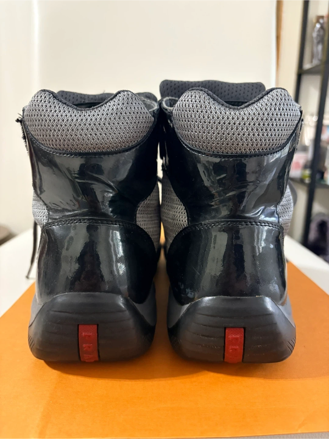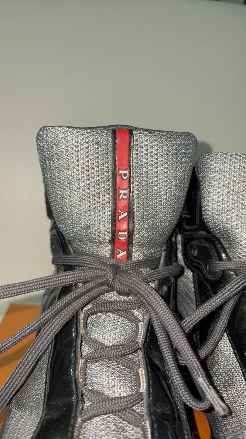 These Prada high-top sneakers are black and grey. They feature a combination of patent leather and mesh materials.