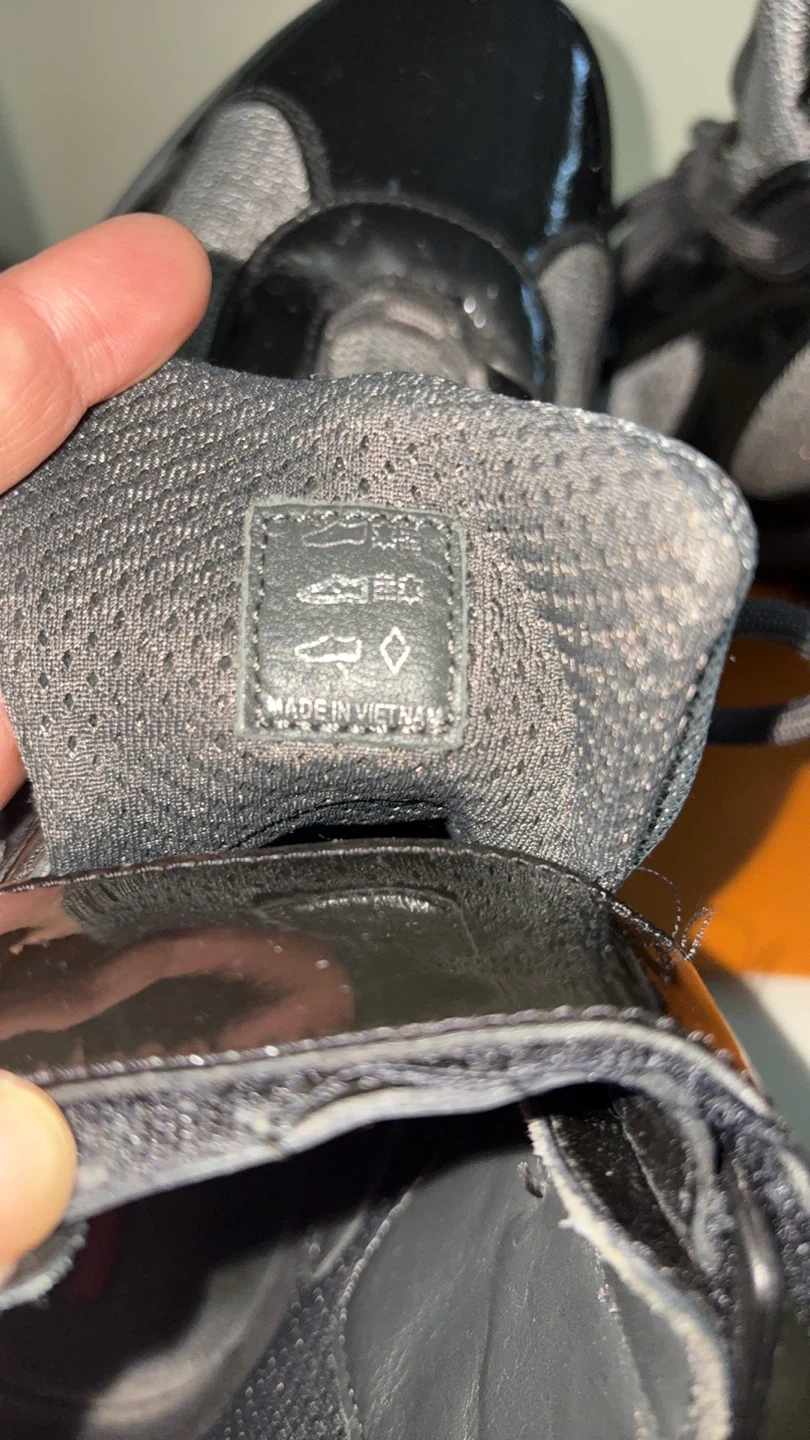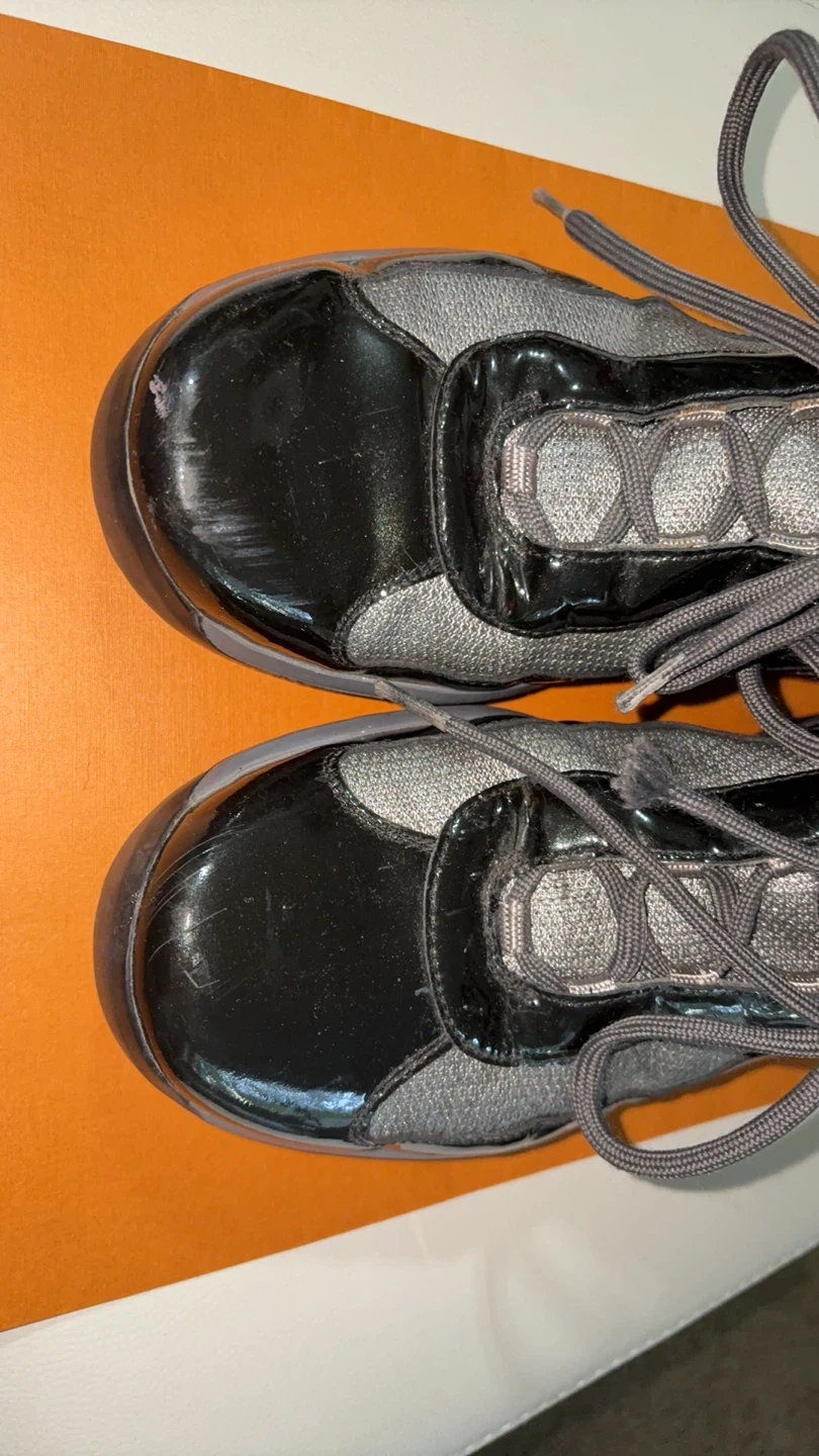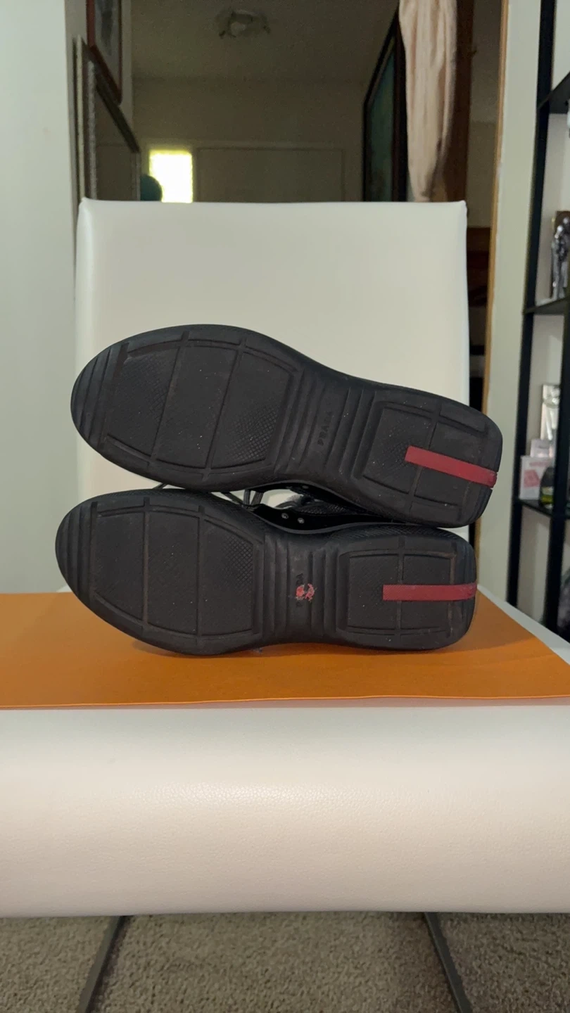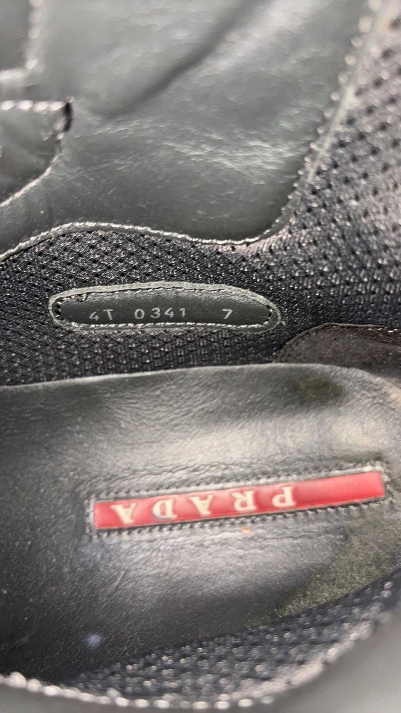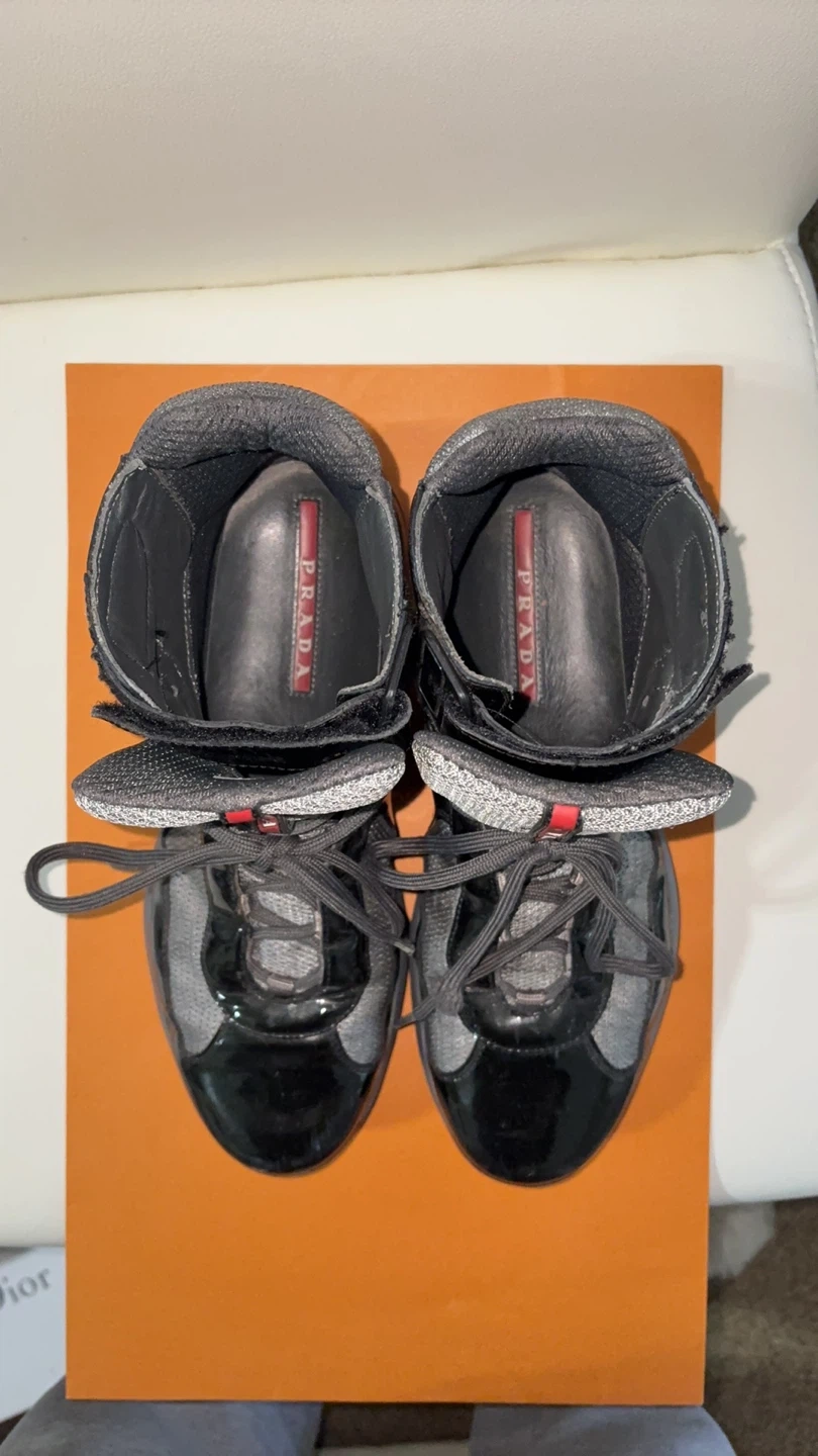 These Prada high-top sneakers are black and grey. They feature a combination of patent leather and mesh materials.