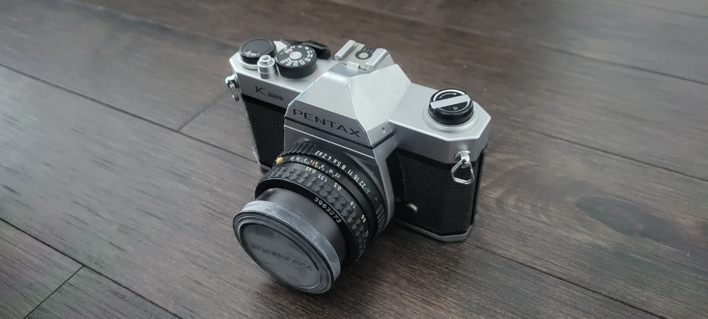 This is a Pentax K1000 35mm film camera. It comes with an SMC Pentax-A 50mm f/1.2 lens attached. This camera is great for learning film photography. THIS CAMERA HAS NOT BEEN SERVICED.