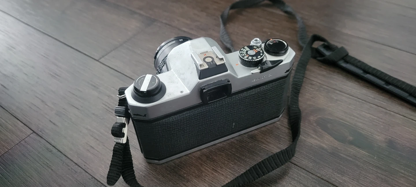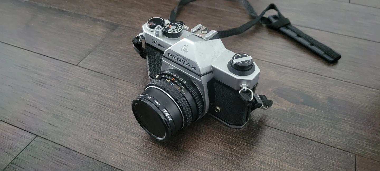 This is a Pentax K1000 35mm film camera. It's a classic SLR camera, great for learning photography. Comes with a lens and a protective case.