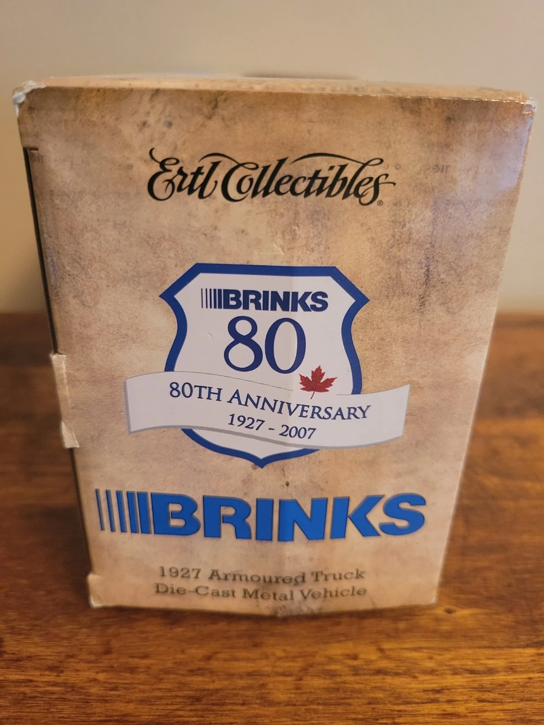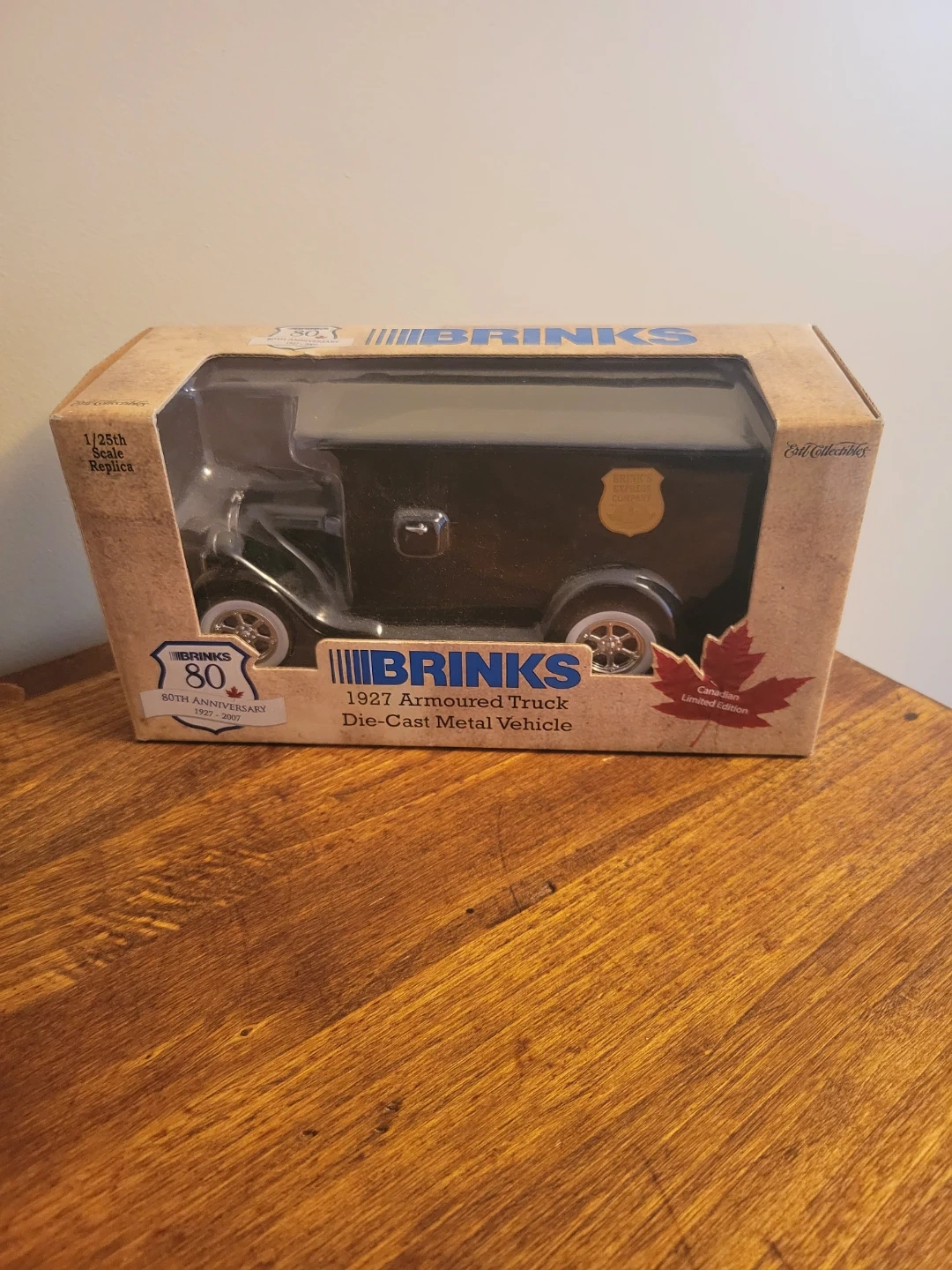 Brinks 1927 Armoured Truck die-cast metal vehicle, produced by ERTL Collectibles. It is a 1:25 scale model, which often functions as a collectible bank. This specific version is a Canadian limited edition released for the Brinks 80th Anniversary.