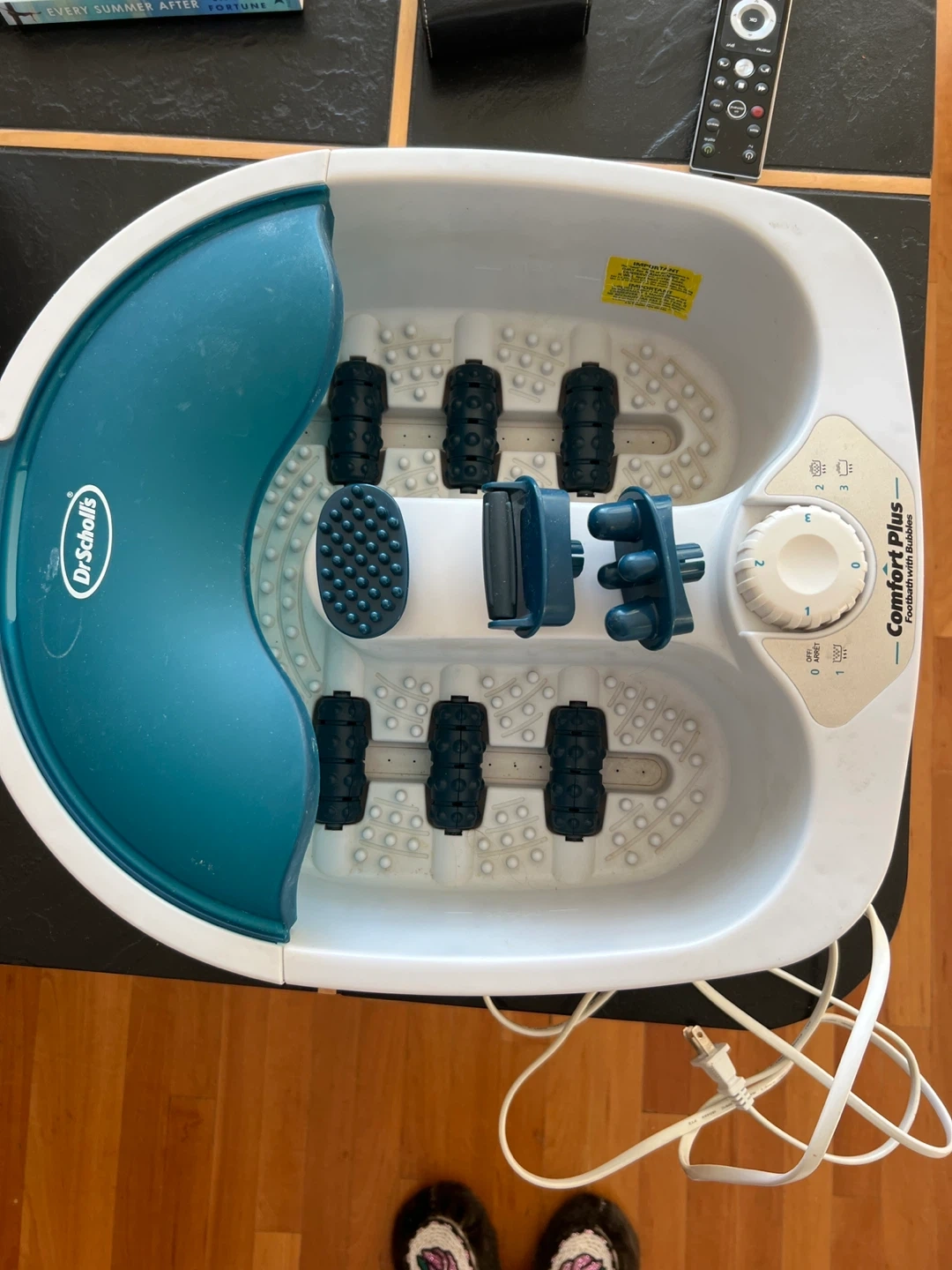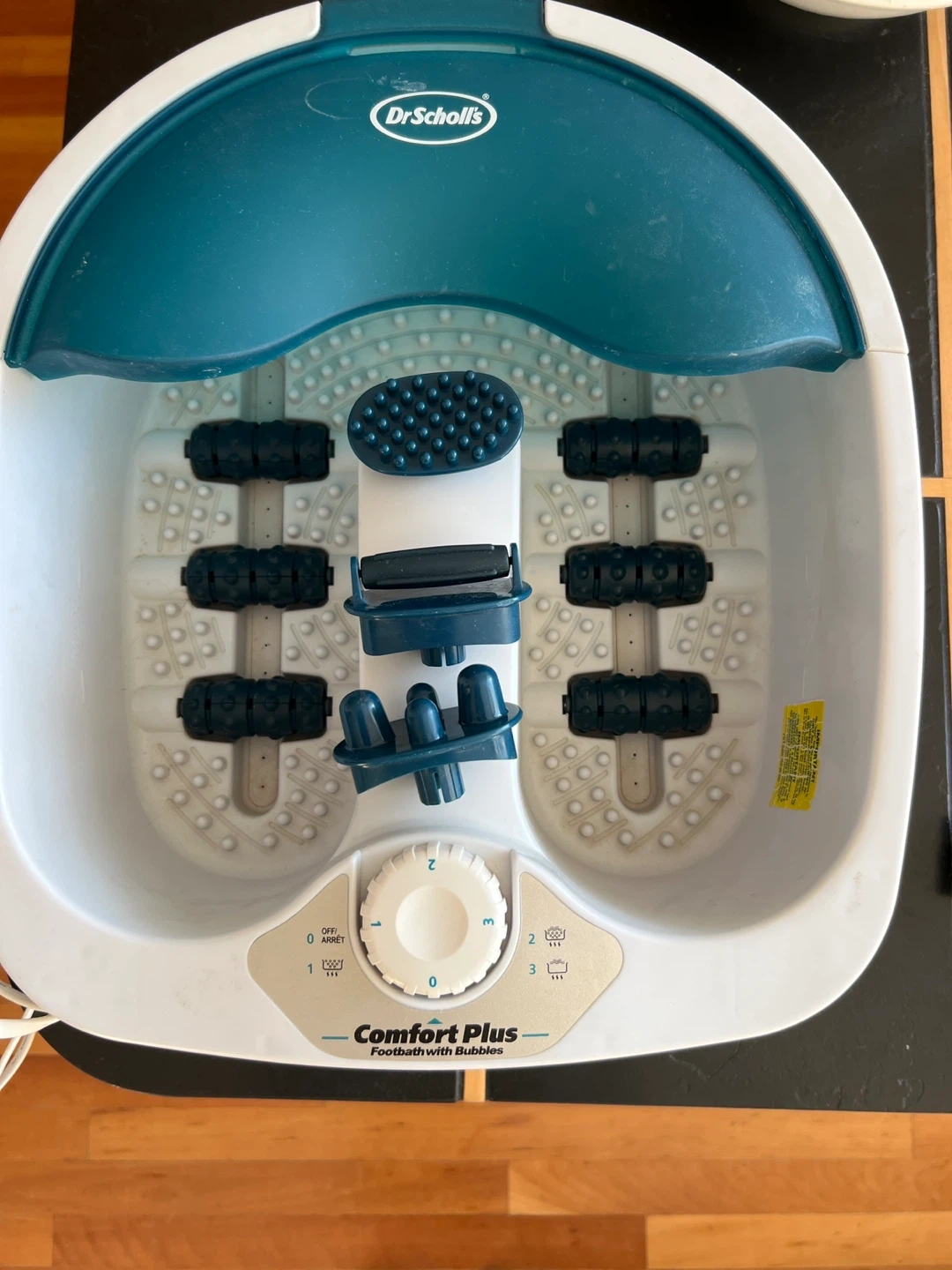 This Dr. Scholl's Comfort Plus foot spa features bubble action to soothe tired feet. It has multiple massage rollers for a relaxing experience. Settings include 0 for OFF and 1, 2, or 3 for bubble intensity.