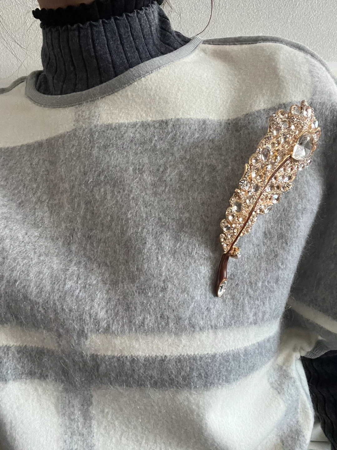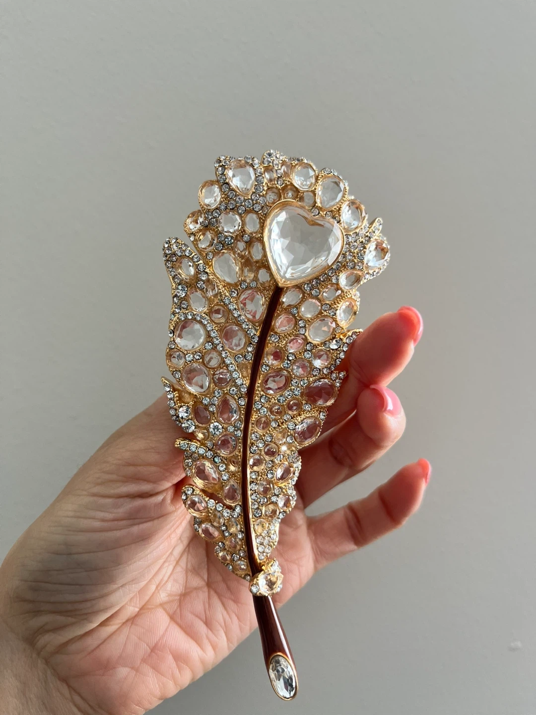 This decorative brooch is designed like a feather and encrusted with clear crystals. It features a prominent heart-shaped crystal at the top. The metallic base has a gold-tone finish.