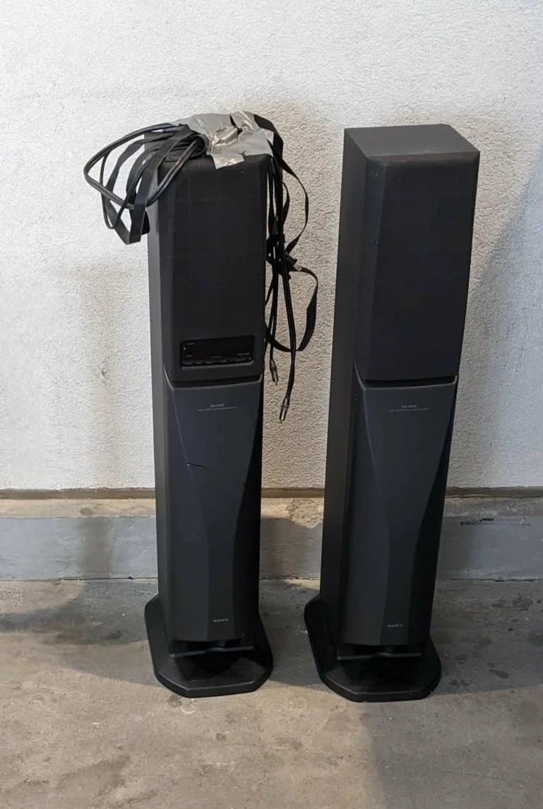 Two Sony floor standing speakers in black. Includes speaker wire taped to the top of one unit. They're in good condition and ready for use!