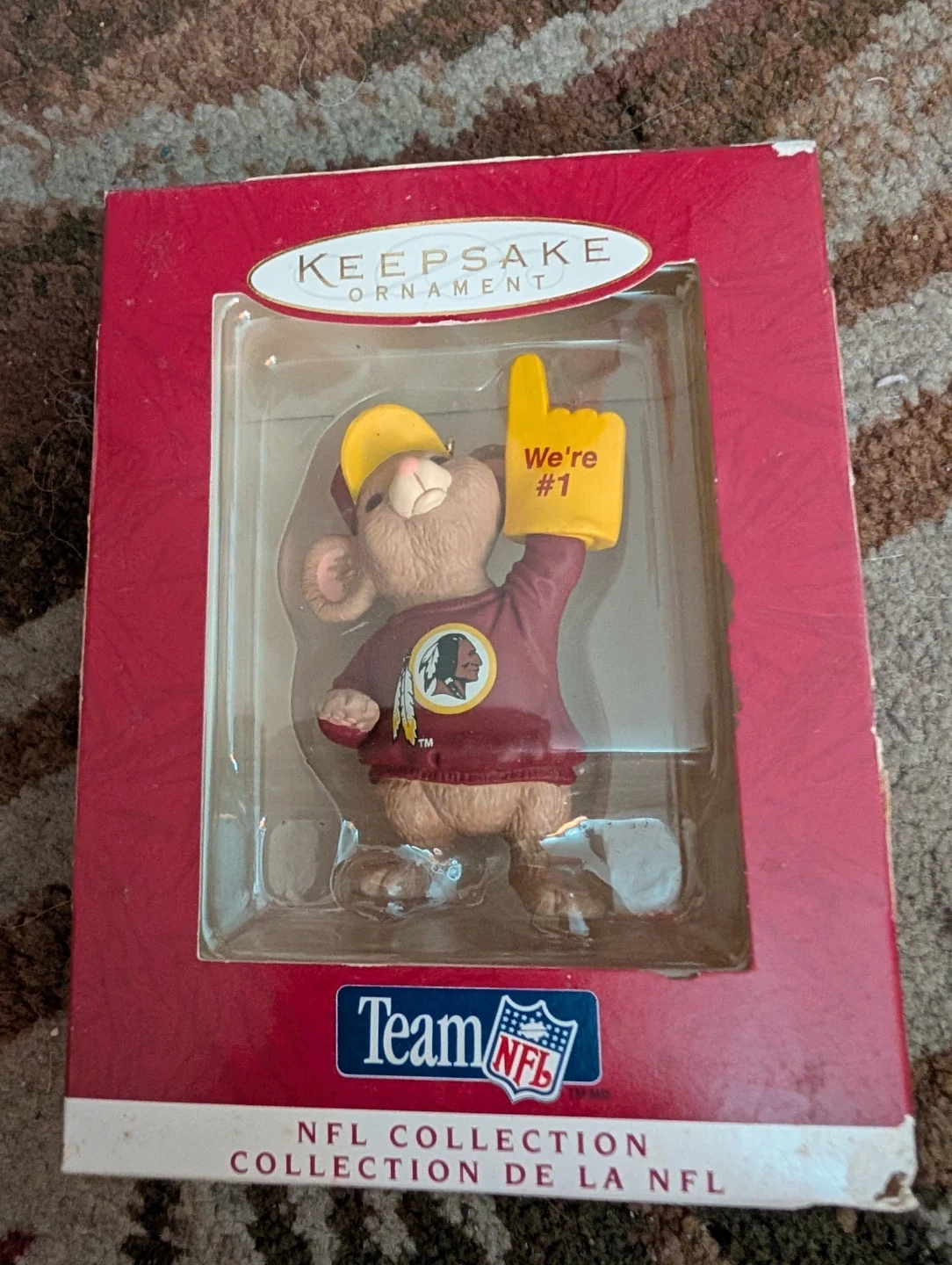 This is a Washington Redskins NFL Keepsake Ornament featuring a mouse character. It's part of the NFL Collection and comes in original packaging. The ornament says 'We're #1!'