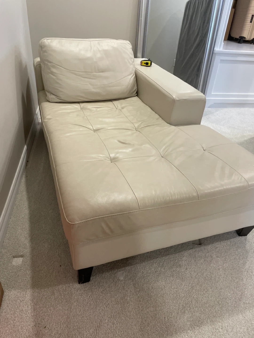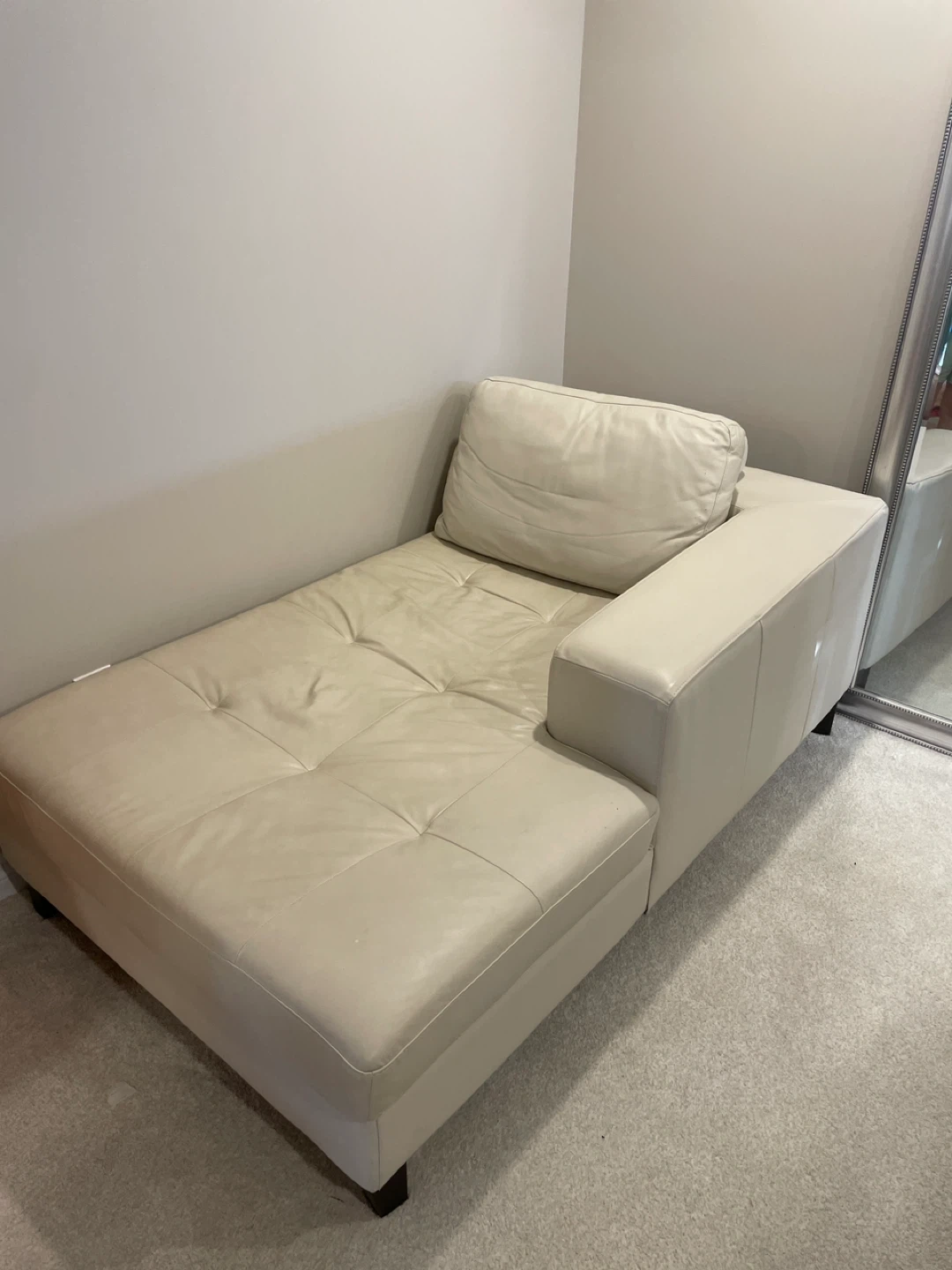 This is a cream-coloured leather chaise lounge. It's tufted for comfort and includes a matching throw pillow. This chaise lounge offers a stylish spot to relax.