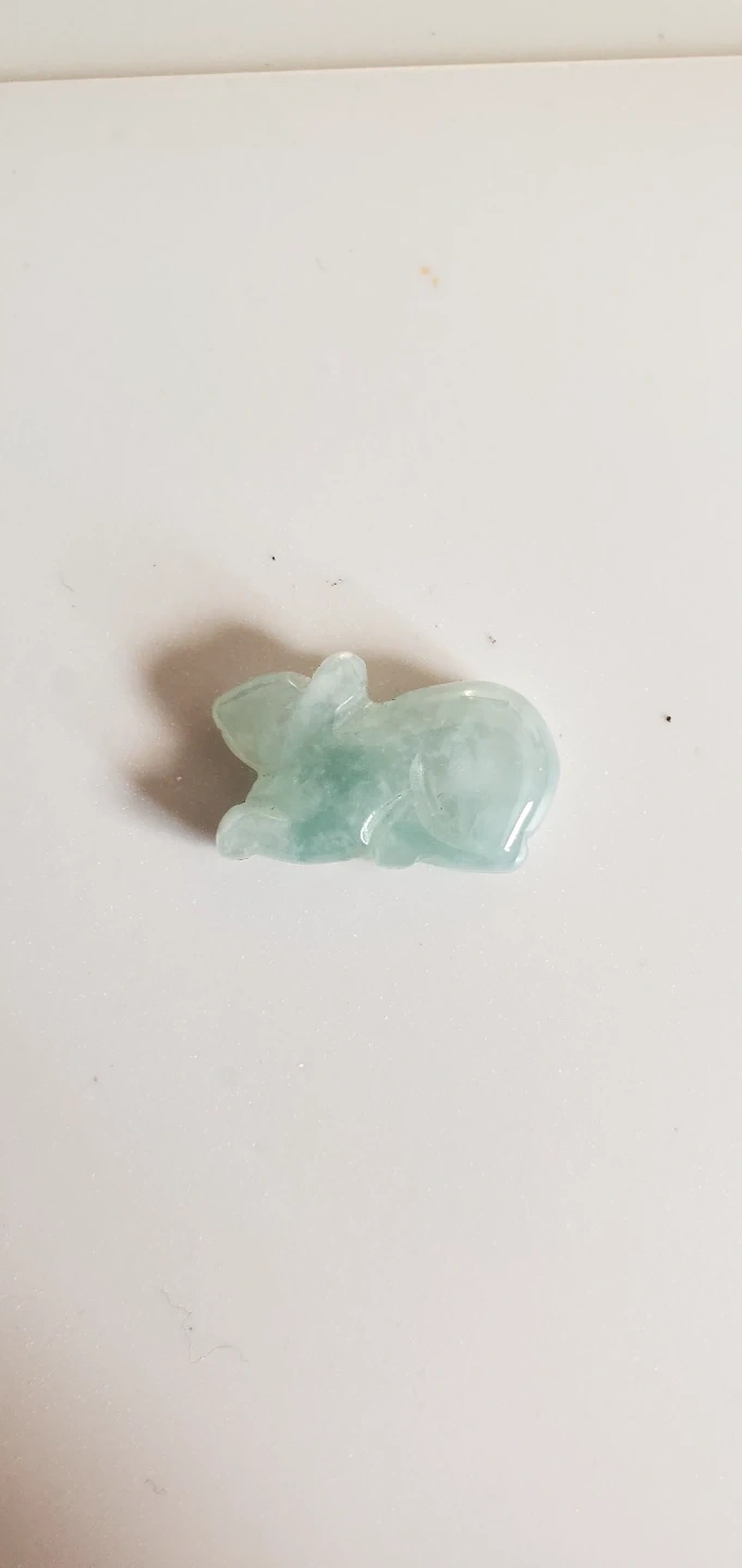 This is a carved jade pendant shaped like a rabbit. It's a light green translucent colour. This charm could be added to a necklace or bracelet. It's the size of a big thumbnail.