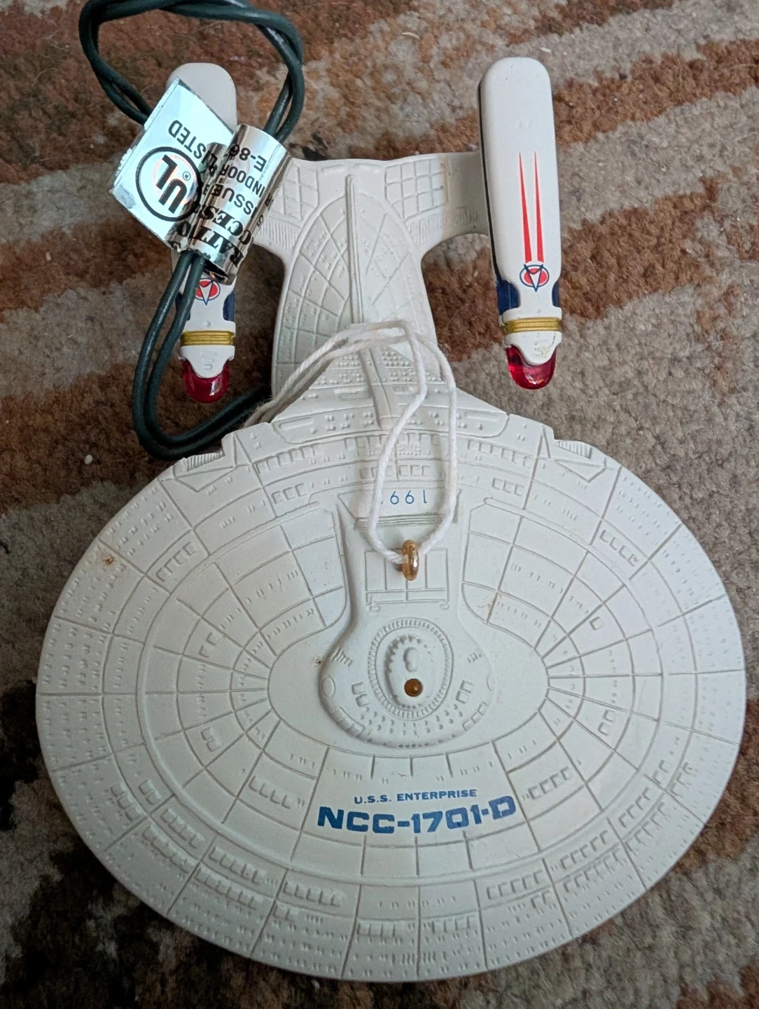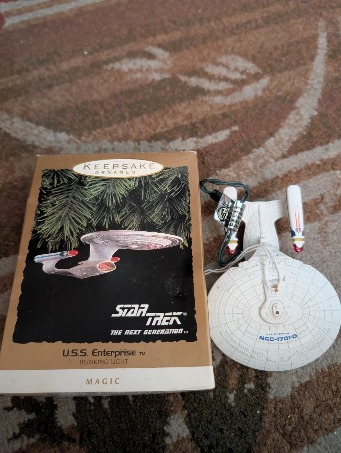 Hallmark Keepsake Ornament featuring the U.S.S. Enterprise from Star Trek: The Next Generation. It has a blinking light feature. Includes the original box. This ornament is a great addition for any Star Trek fan's holiday decor!
