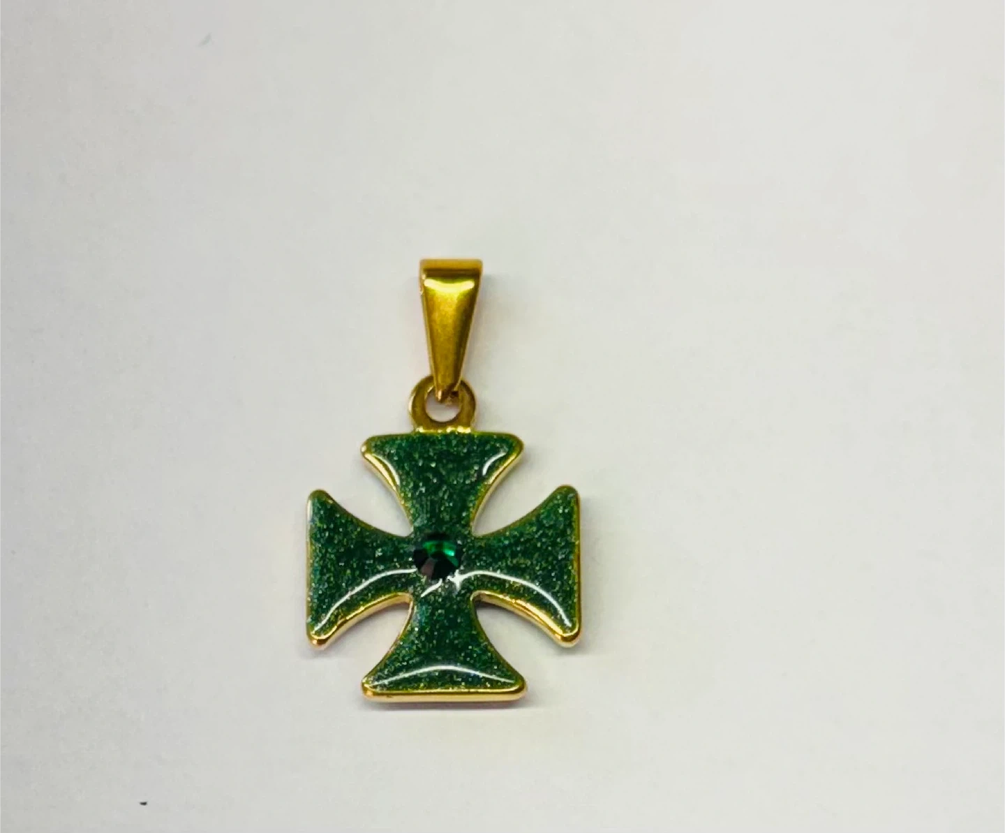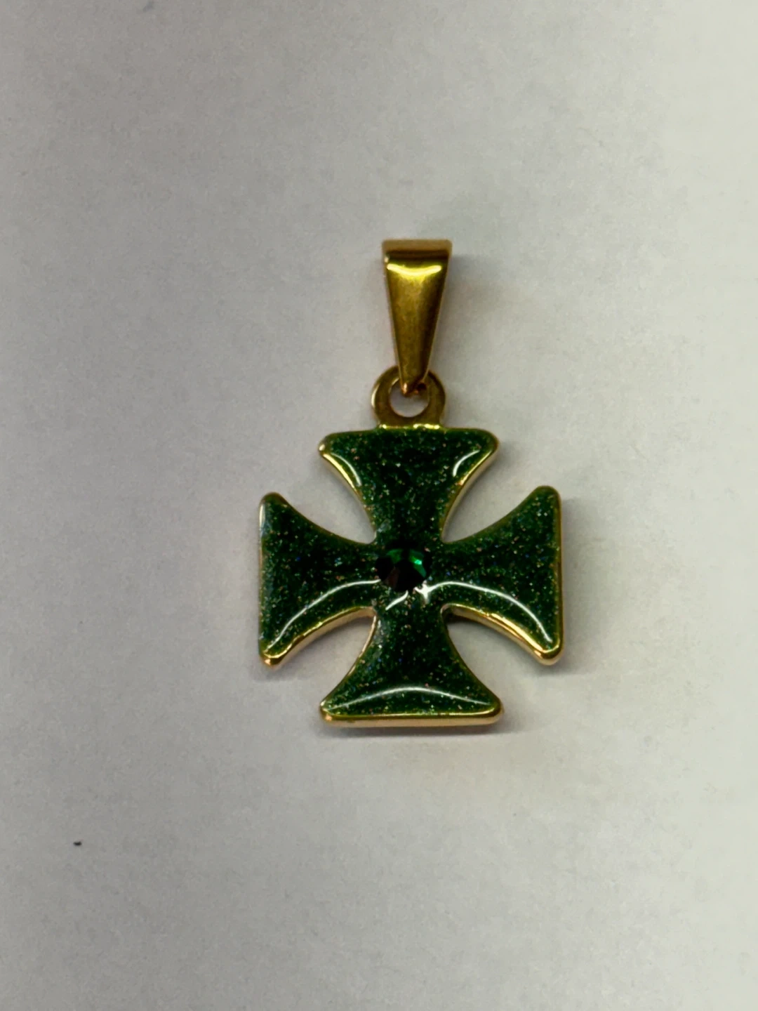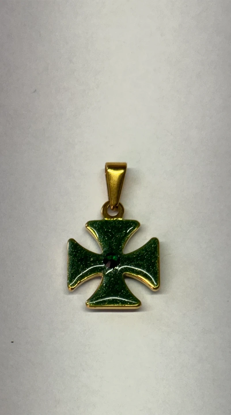This green cross pendant features a sparkling emerald accent in the center. It has a gold-tone bail for easy attachment to a chain. Measures about 1 inch long.
