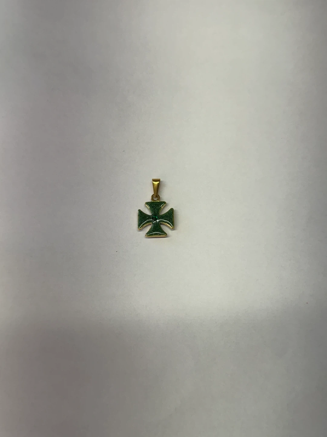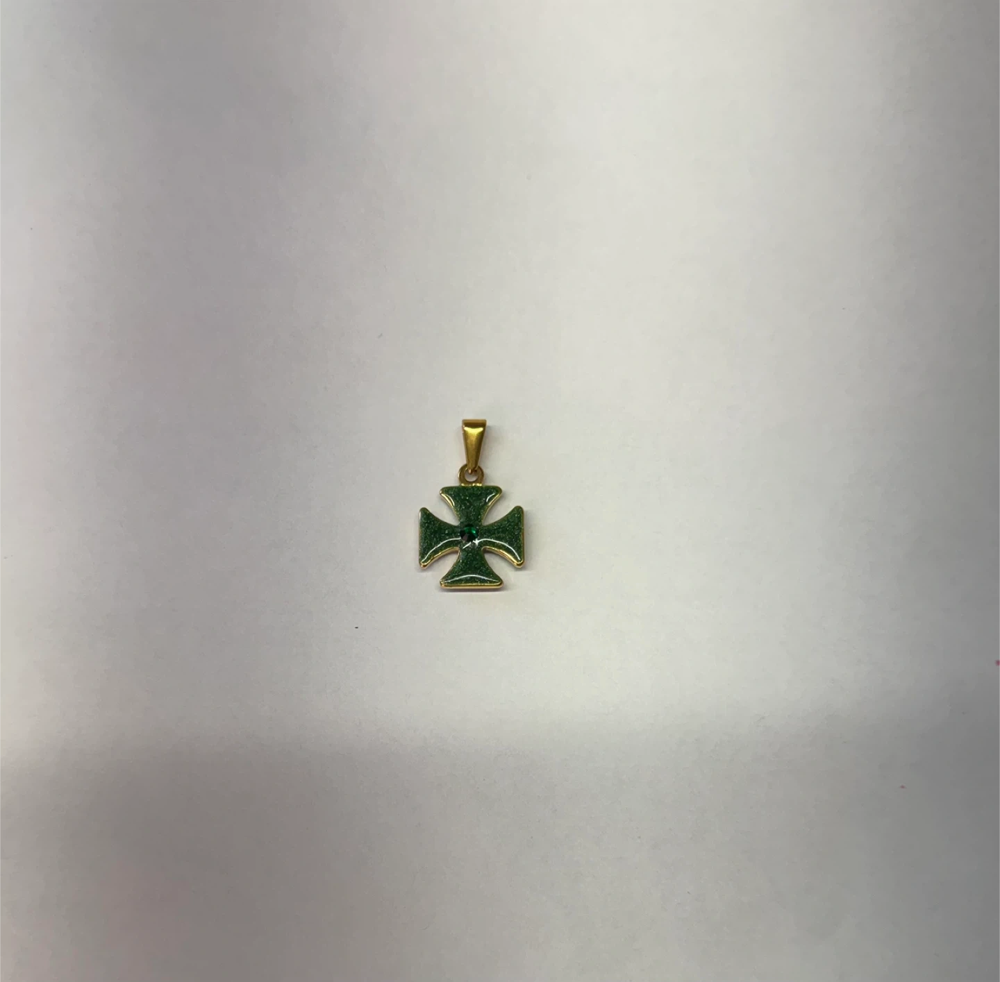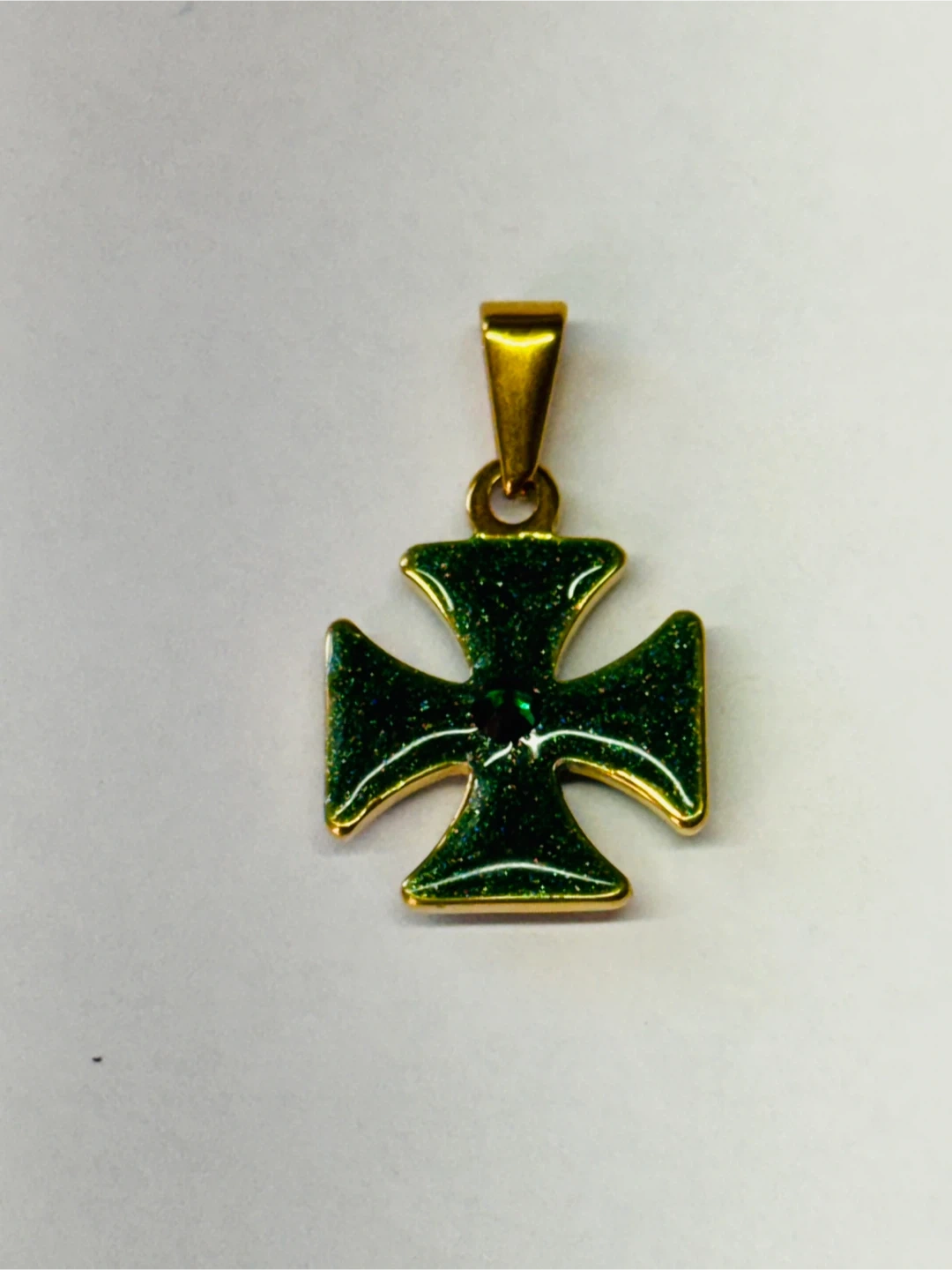 This green cross pendant features a sparkling emerald accent in the center. It has a gold-tone bail for easy attachment to a chain. Measures about 1 inch long.