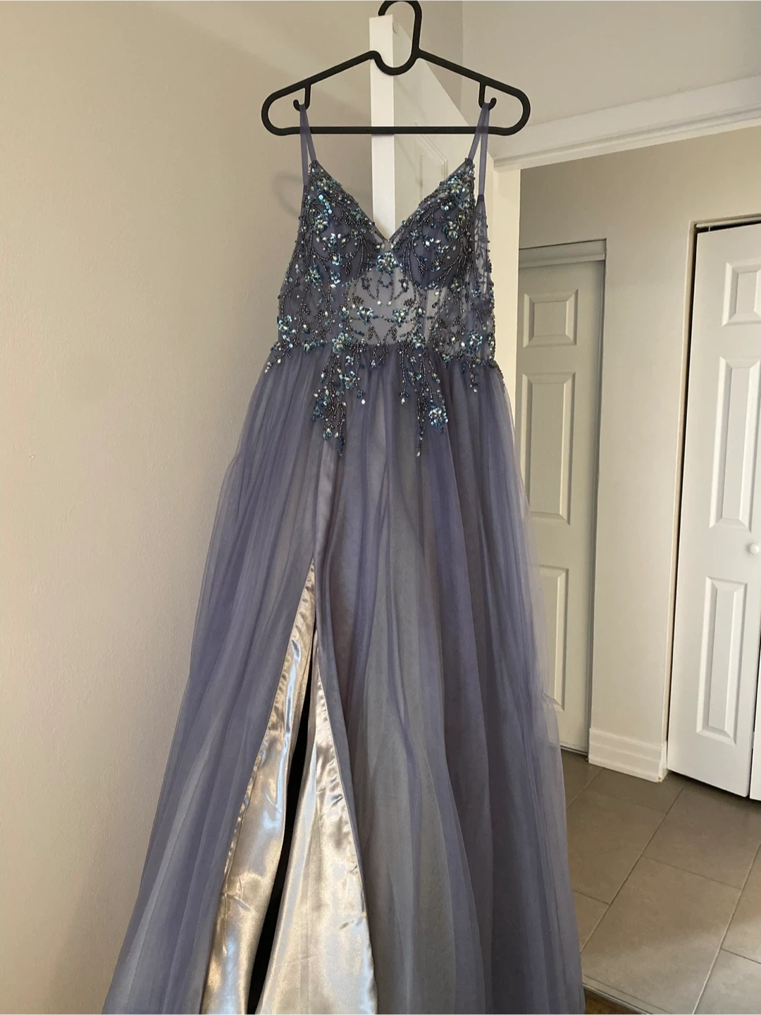 This is a beautiful ZAPAKA prom dress with spaghetti straps. It features intricate beading on the bodice and a flowy tulle skirt with a high slit. Perfect for special occasions! Size 2