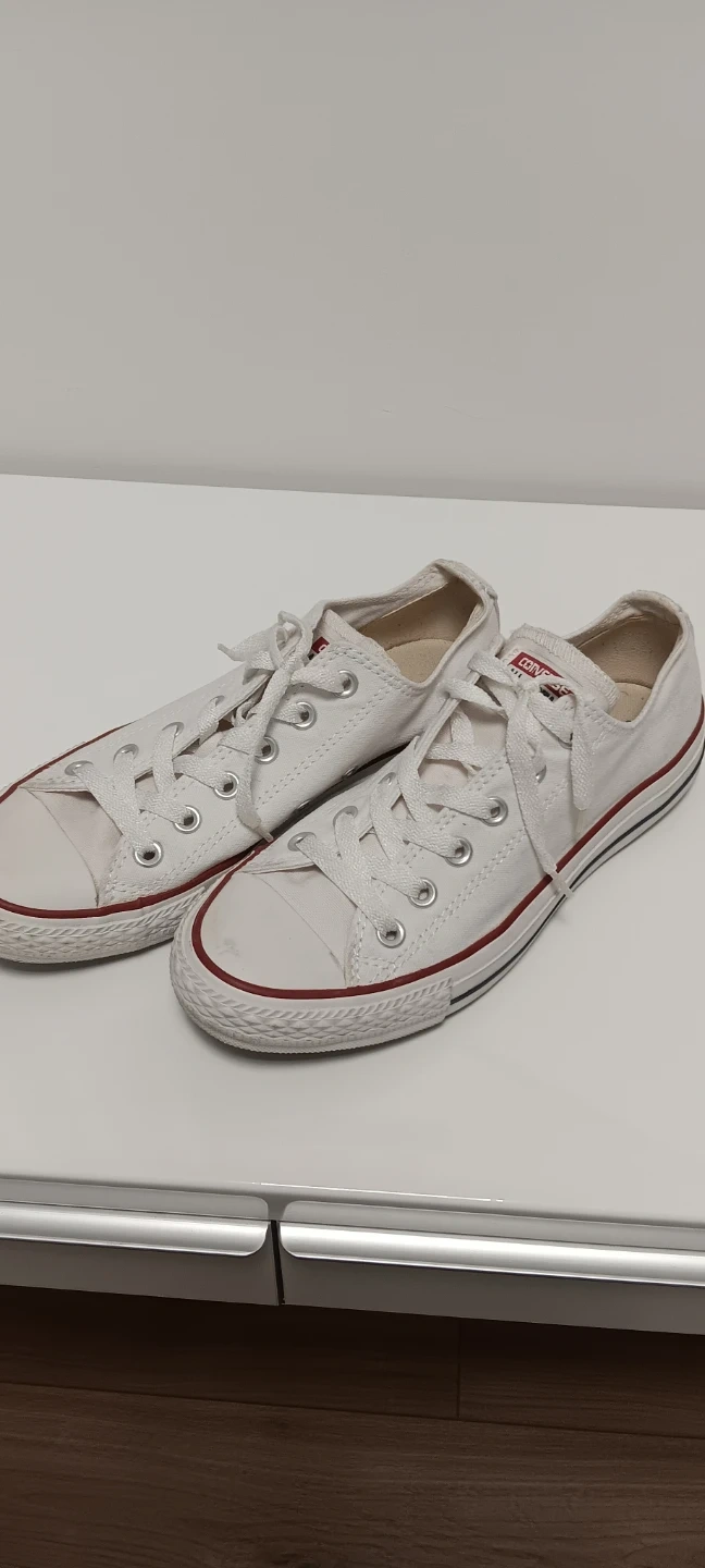 Classic Converse All Star Chuck Taylor low top sneakers in white. Canvas upper with rubber toe cap and red stripe detail on the sole. These are a staple for everyday wear!