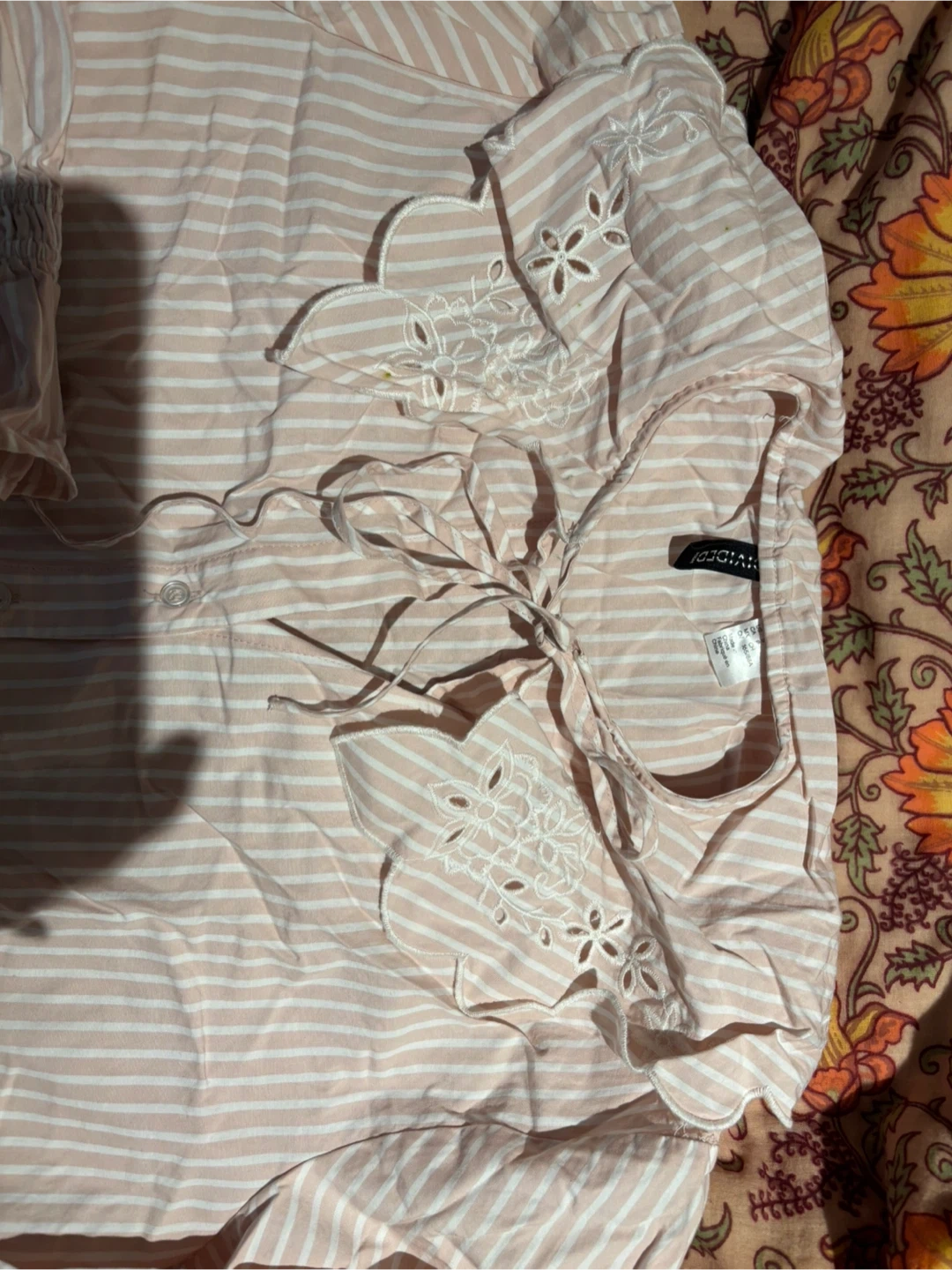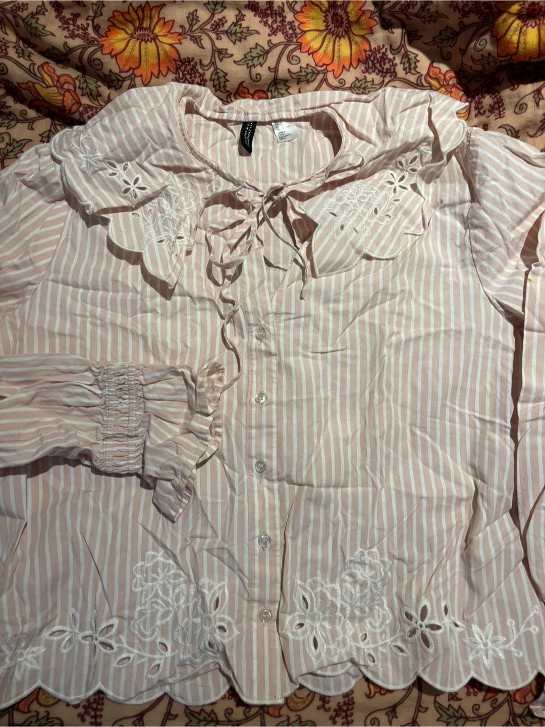 This H&M blouse has a lovely pink and white stripe pattern. It features a cute Peter Pan collar with embroidered floral details and a tie-front closure. The sleeves have elasticated cuffs for a comfortable fit. It's a stylish piece for any wardrobe!