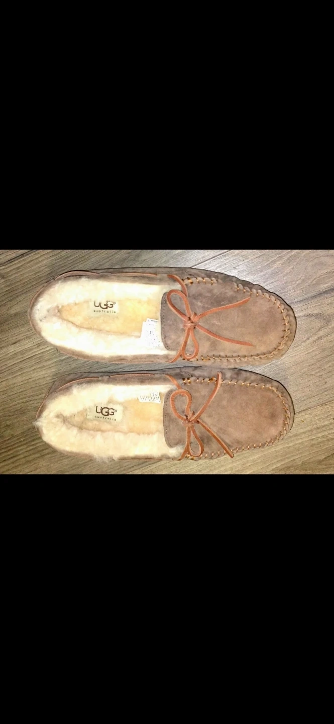 These UGG Australia moccasins are New, lined with soft sheepskin for warmth and comfort. The exterior is a taupe suede with a stitched toe and a lace tie detail. They're great for winter outdoors or indoors, only tested outside, no box, already thrown away